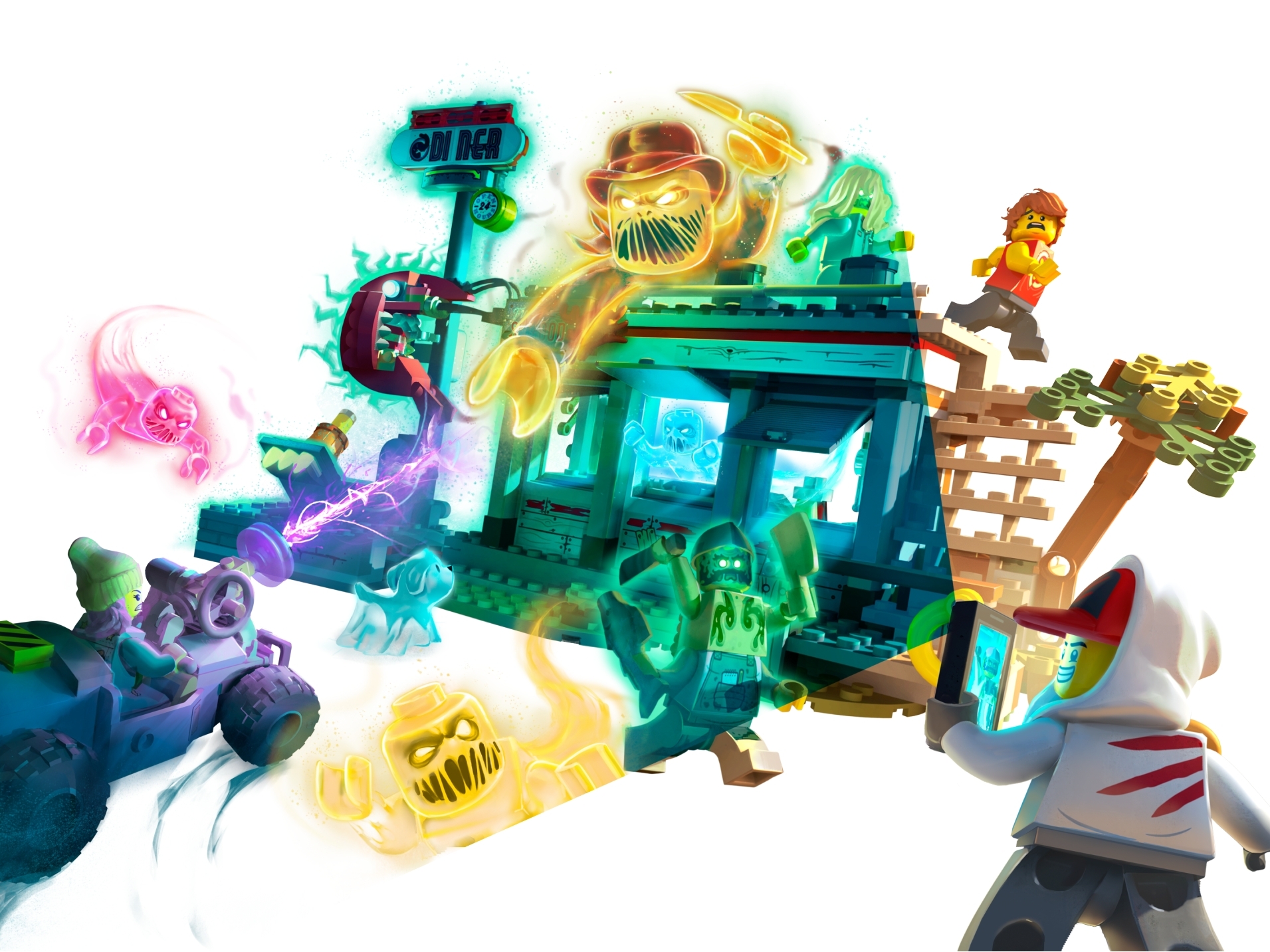 Das Spielzeug mit Augmented Reality Funktionen enthält 6 Figuren: Die männliche Minifigur Jack Davids mit Smartphone und die weibliche Minifigur Parker L. Jackson mit Smartphone, Küchenchef Enzo mit 2 Messern, Sally mit Tablett und Tasse, Ronny und Jacks Geisterhund Spencer.