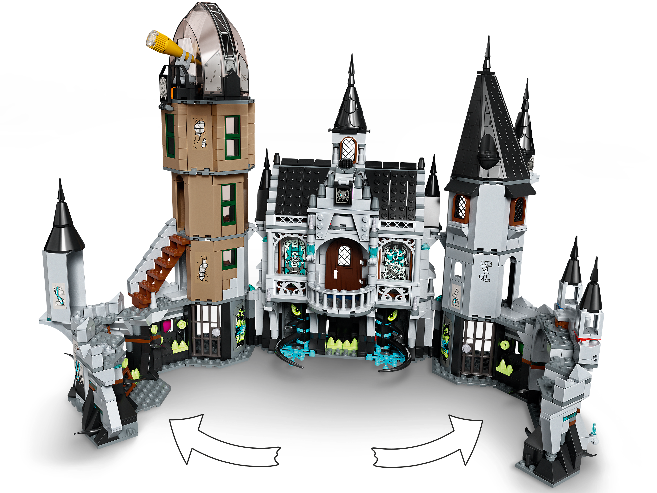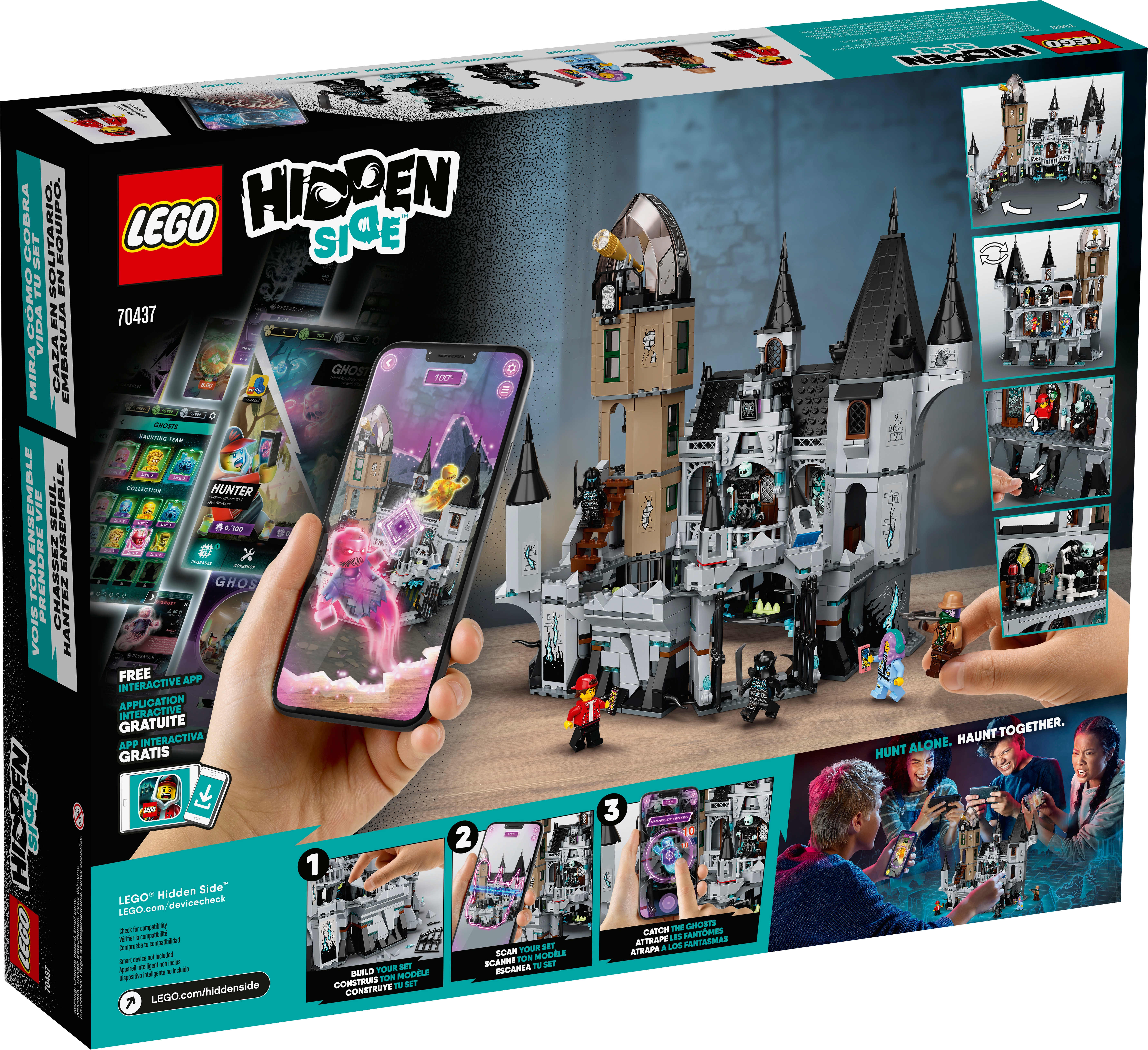Die geheimnisvolle Burg erwacht zum Leben, wenn sie durch ein Smartphone oder Tablet mit der LEGO® Hidden Side™ AR-App betrachtet wird. Kinder können dann in dieser aufregenden digitalen Spielwelt auf Entdeckung gehen, Geheimnisse lüften, Geister jagen und sich mit dem Geisterboss The Maw messen. Das Modell der Geisterburg lässt sich ausklappen, um als Kulisse für actionreiche Rollenspiele mit Jack, Parker, Vaughn, Nehmaar Reem und 2 Schattenläufern zu dienen, die im Set als Minifiguren enthalten sind.