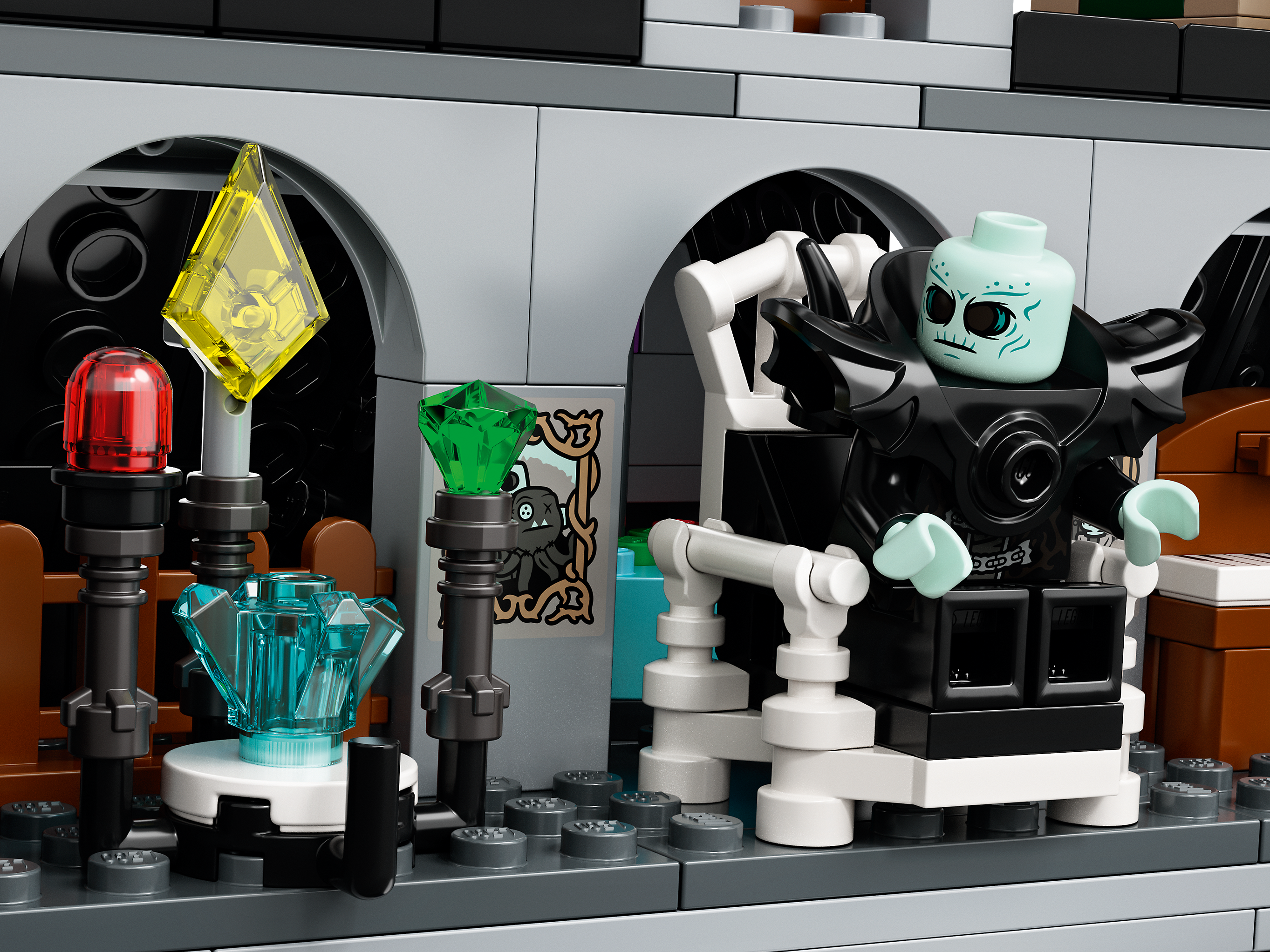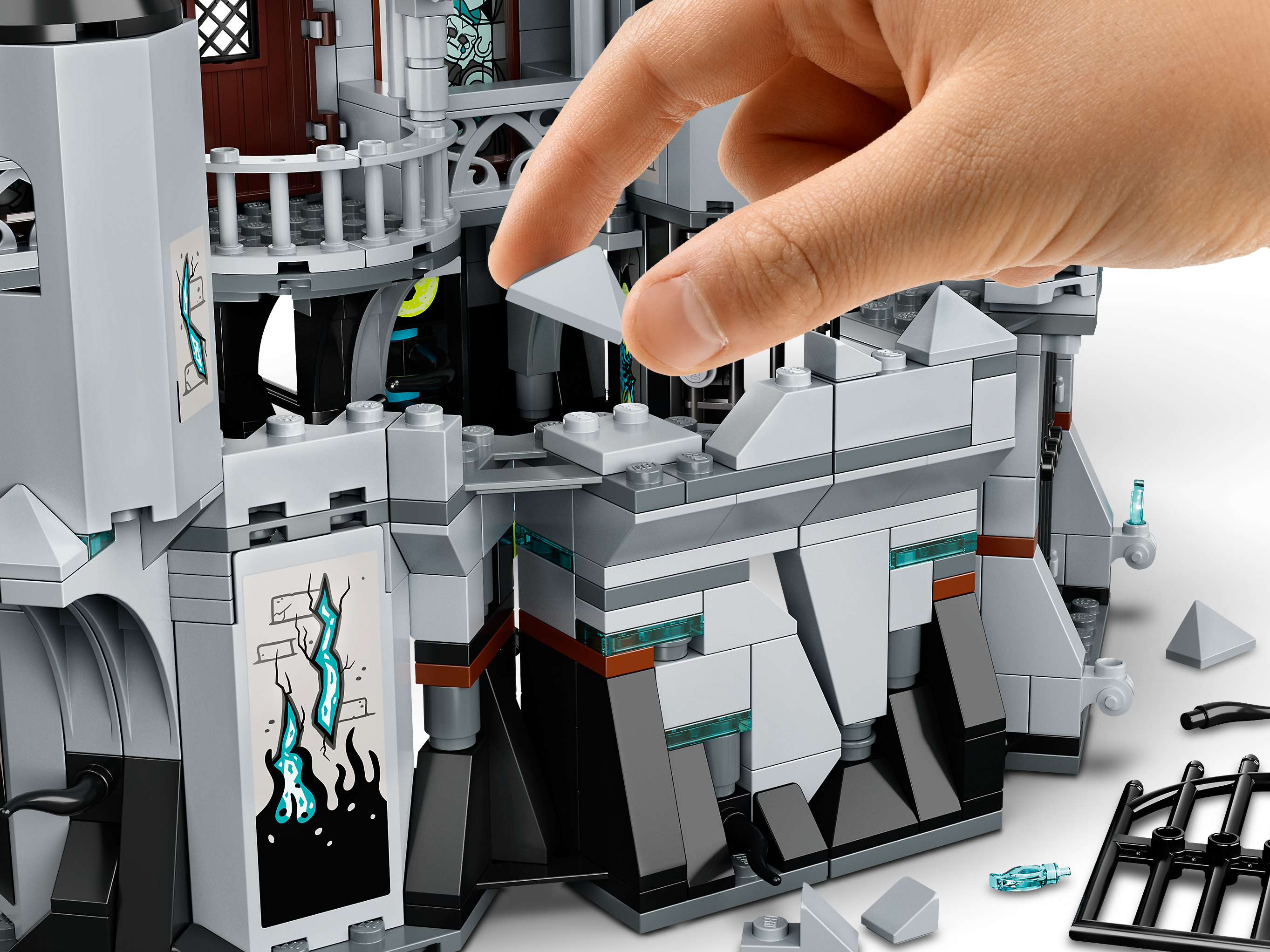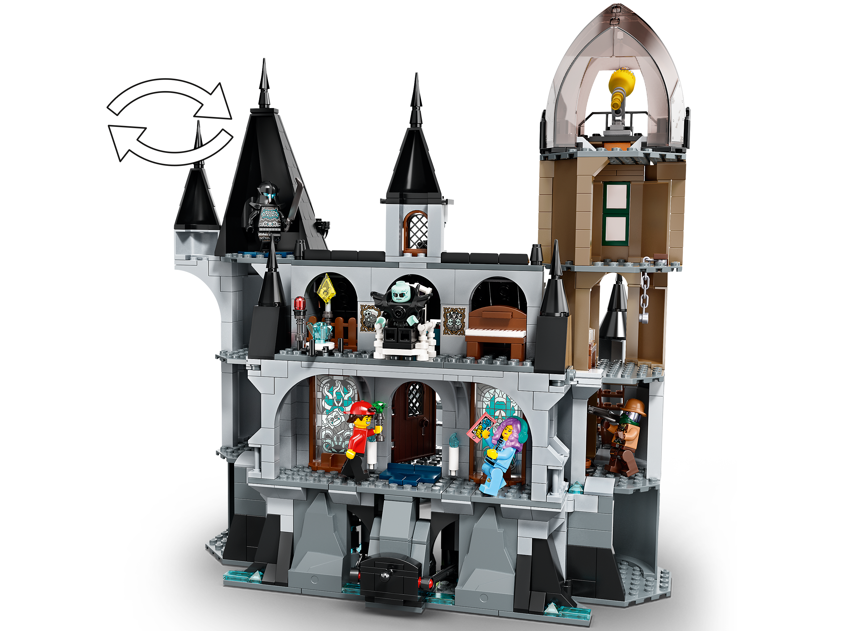 Inhalt des Sets Ein interaktives LEGO® Hidden Side Burgmodell mit zahlreichen handbetätigten Funktionen und zugänglichem Aussichtsturm sowie Jack, Parker, Vaughn, Nehmaar Reem und 2 Schattenläufer als Minifiguren.