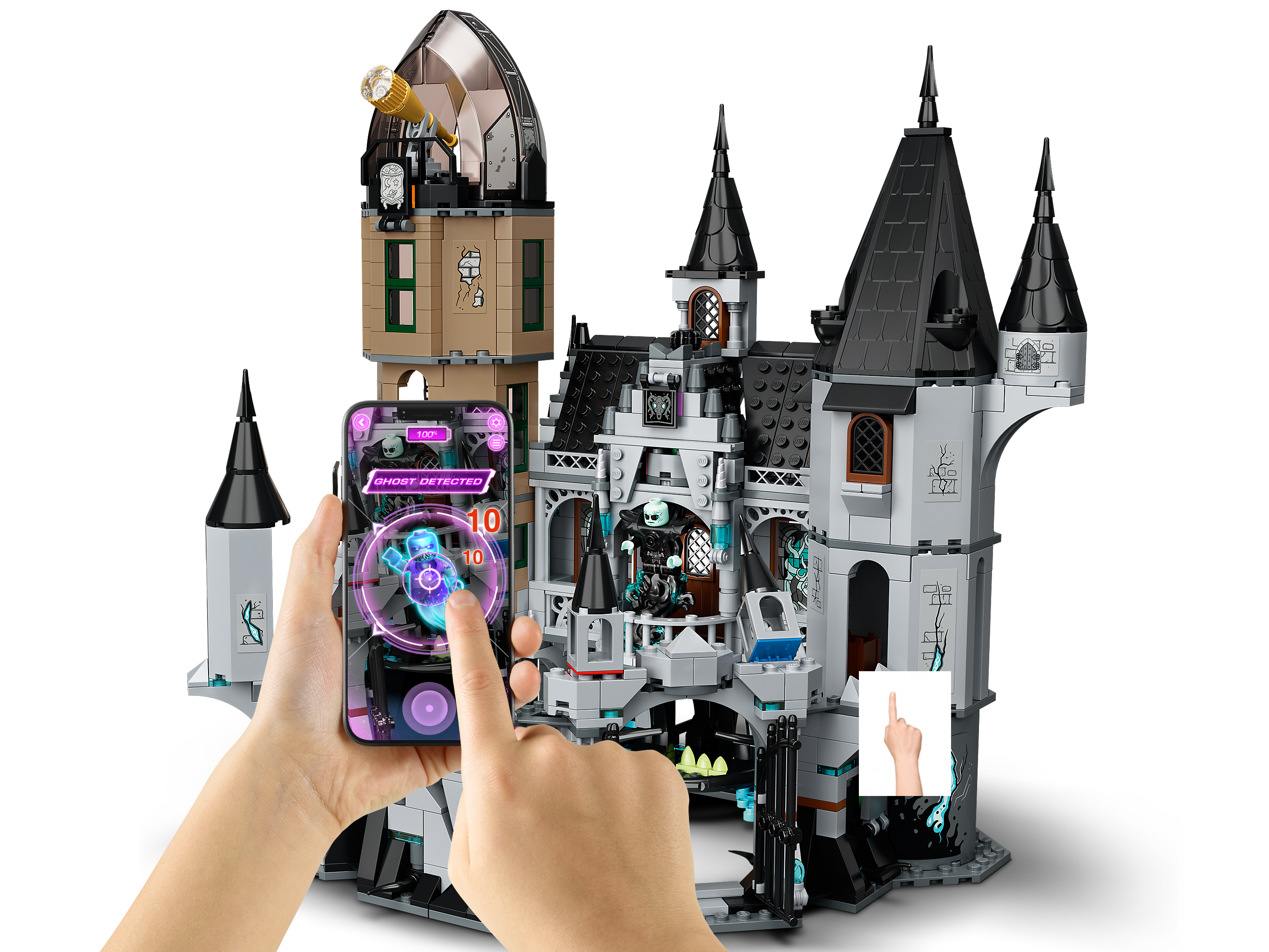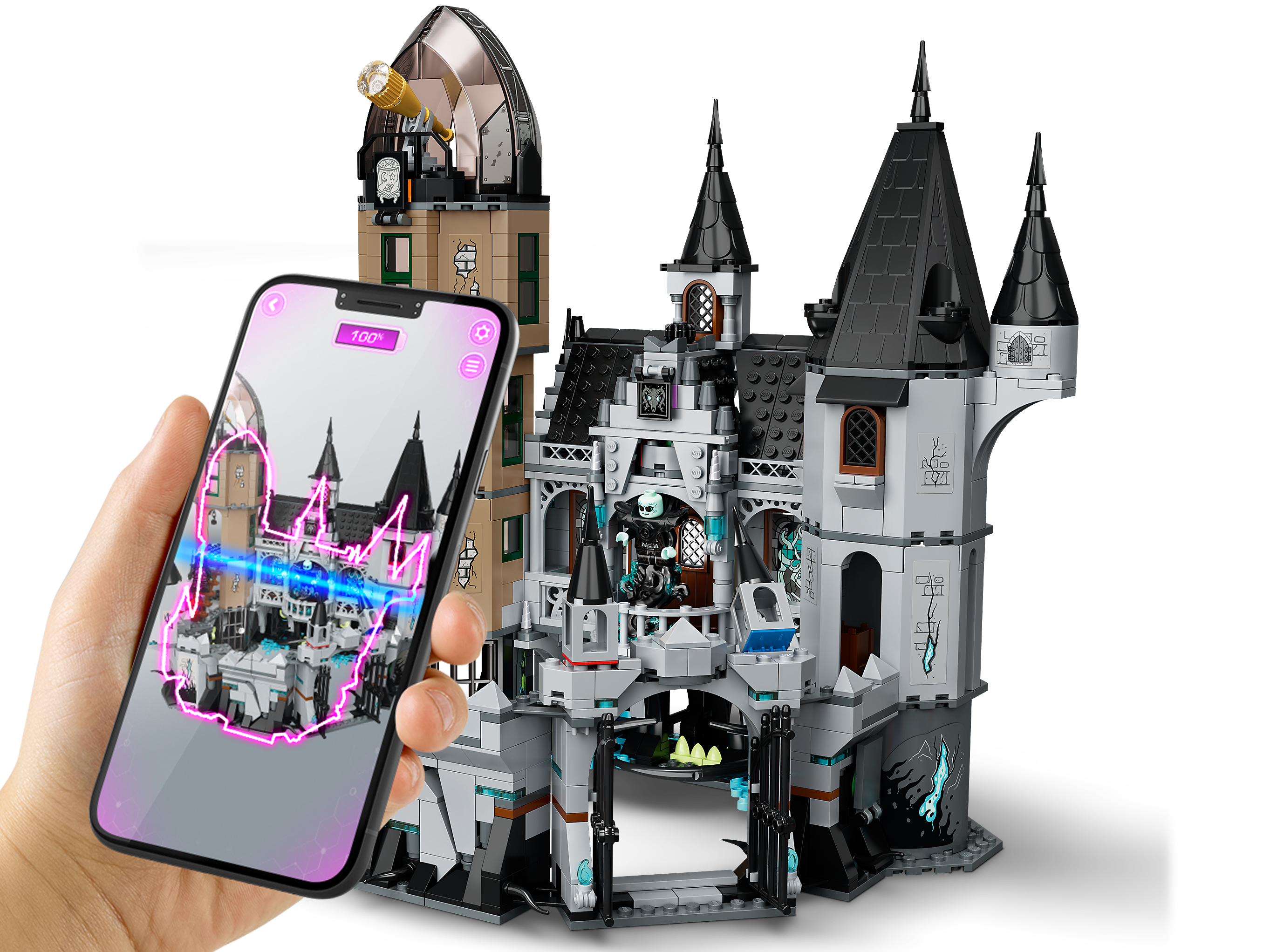 Das Baumodell „Geheimnisvolle Burg“ erwacht zum Leben, wenn es durch ein Smartphone oder Tablet mit der kostenlosen LEGO® Hidden Side™ AR-App betrachtet wird. Kinder können dann in einer digitalen Geisterwelt Geheimnisse lüften, Objekte suchen und Geister jagen.