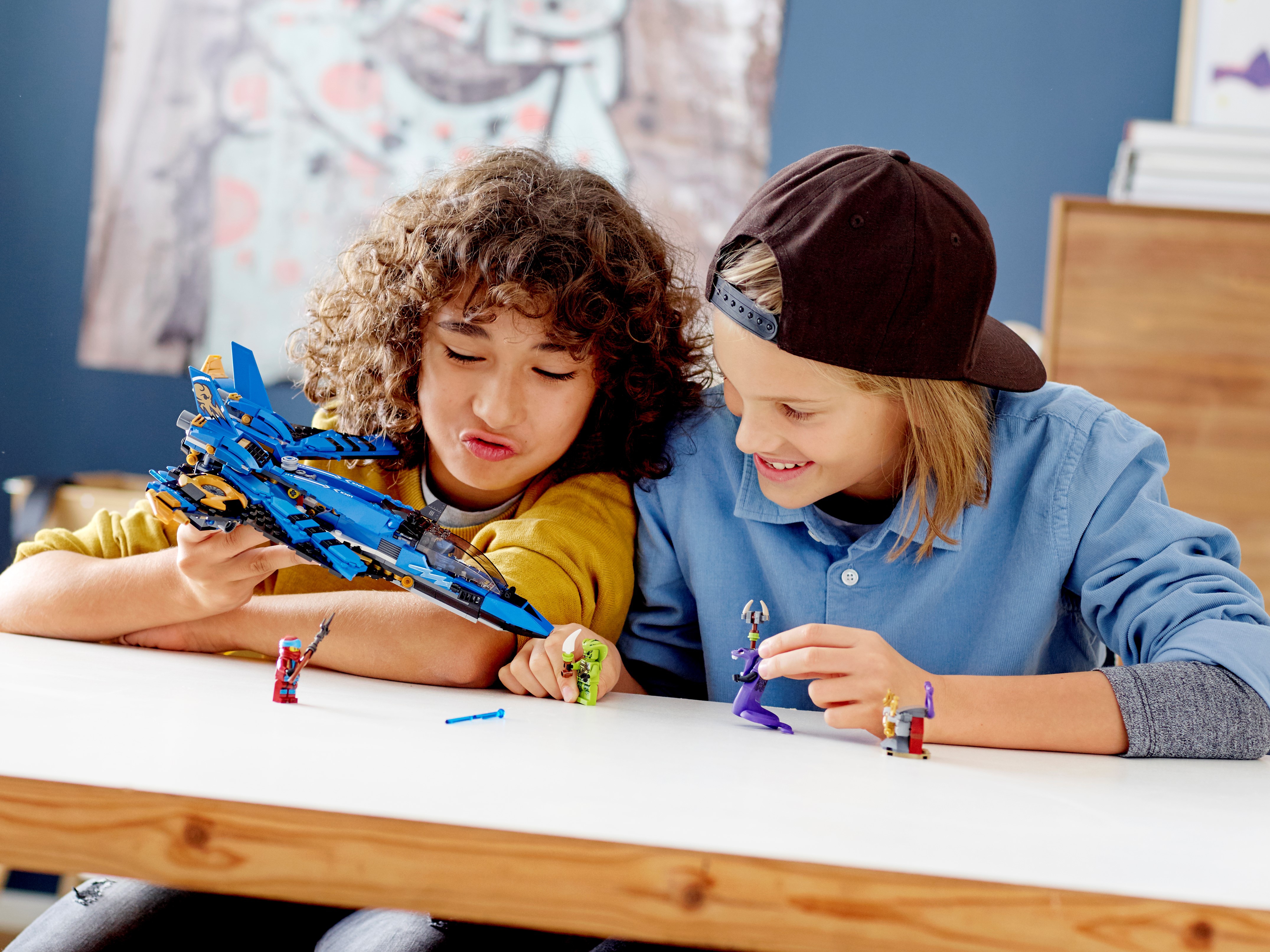 Jays Donner-Jet verfügt über ein aufklappbares Minifiguren-Cockpit mit Stauraum, 2 Shooter mit Federmechanismus, ausklappbare Flügel und ausklappbare goldene Klingen.