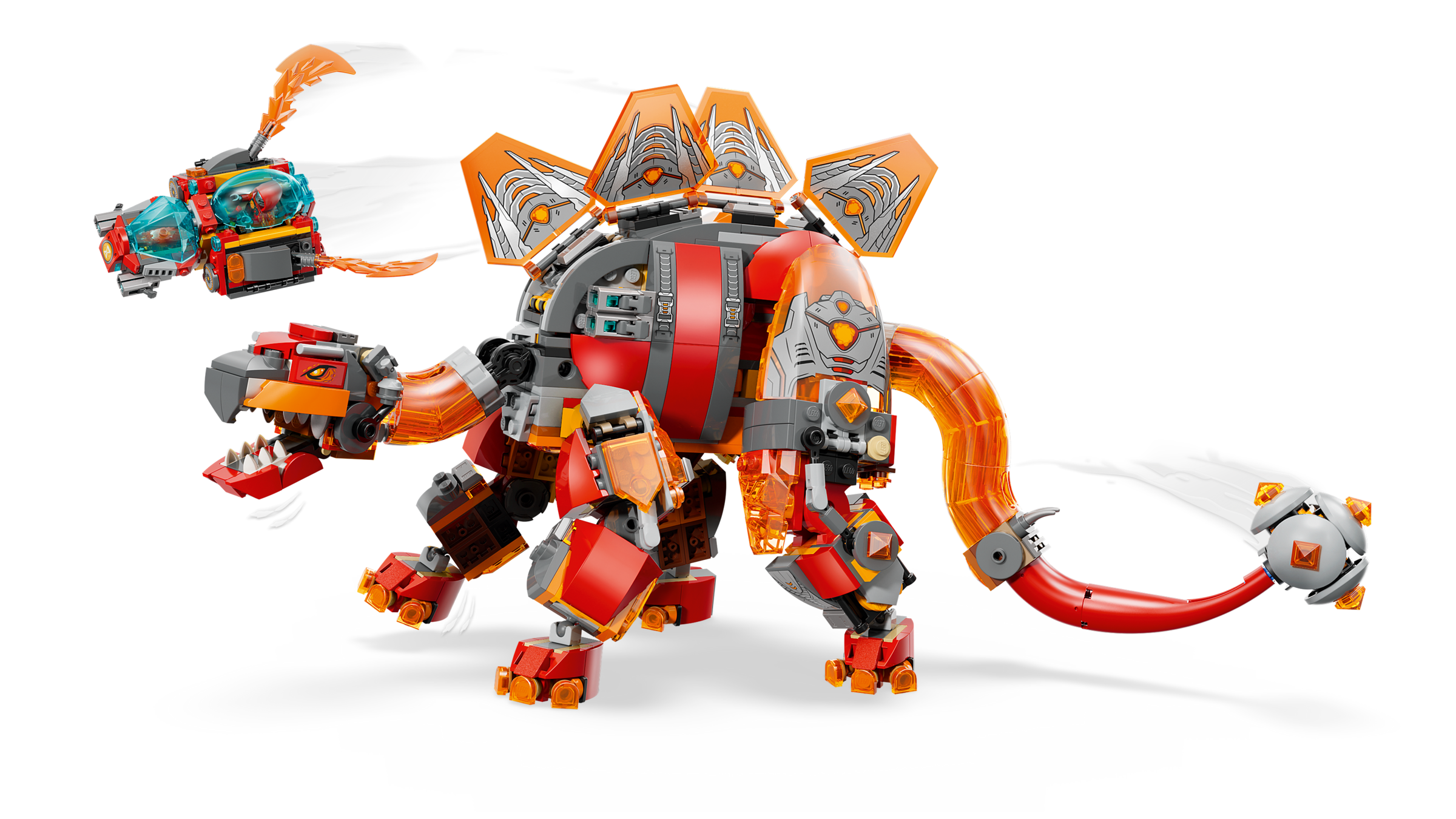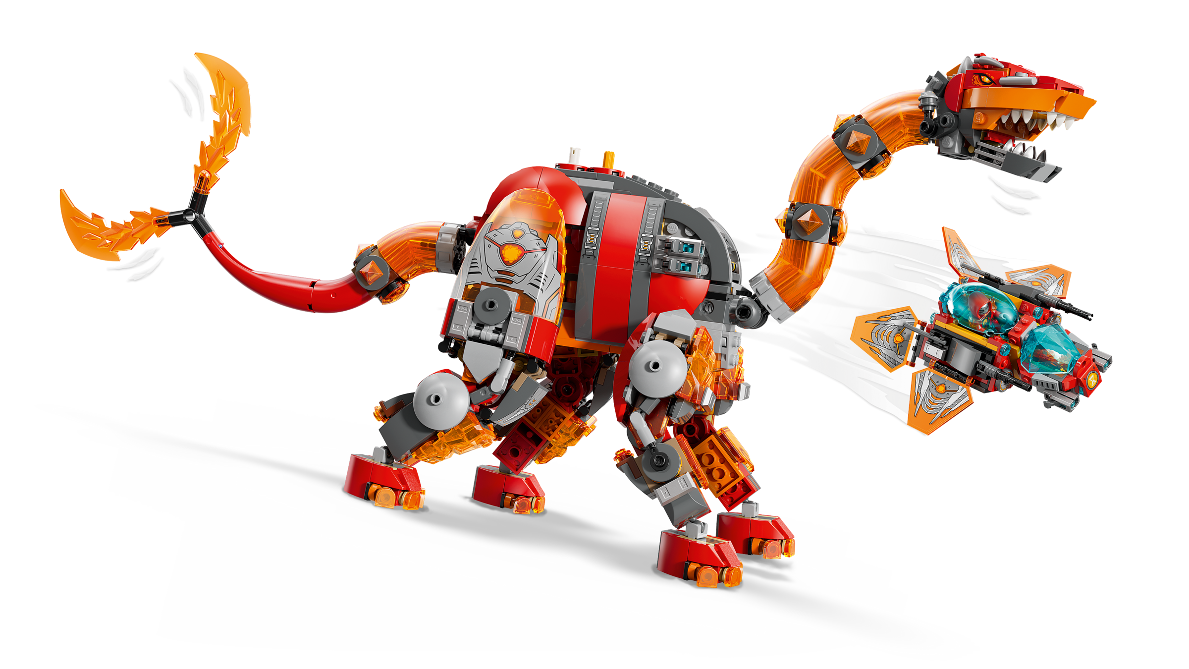 Der Brontosaurus ist ein turmhoher Dinosaurier, der aus geschmolzenem Gestein geschmiedet wird. Er hat einen gewaltigen Doppelschwanz, mit dem er alles wegpeitscht, was ihm in die Quere kommt, sowie ein abnehmbares Raumschiff. Der Stegosaurus ist dagegen eine echte Bestie mit verstärkter Panzerung, loderndem Knüppelschwanz und einem separaten Raumschiff. Zu dem Bauset gehören neben den Dinos auch 4 Minifiguren für Rollenspiele. Sie schwingen Schwerter, um 3 Spinnen zu verscheuchen. Ein Diamant-Ei sowie eine Orangefarbene und eine Blaue Schatzkreatur sind ebenfalls enthalten.