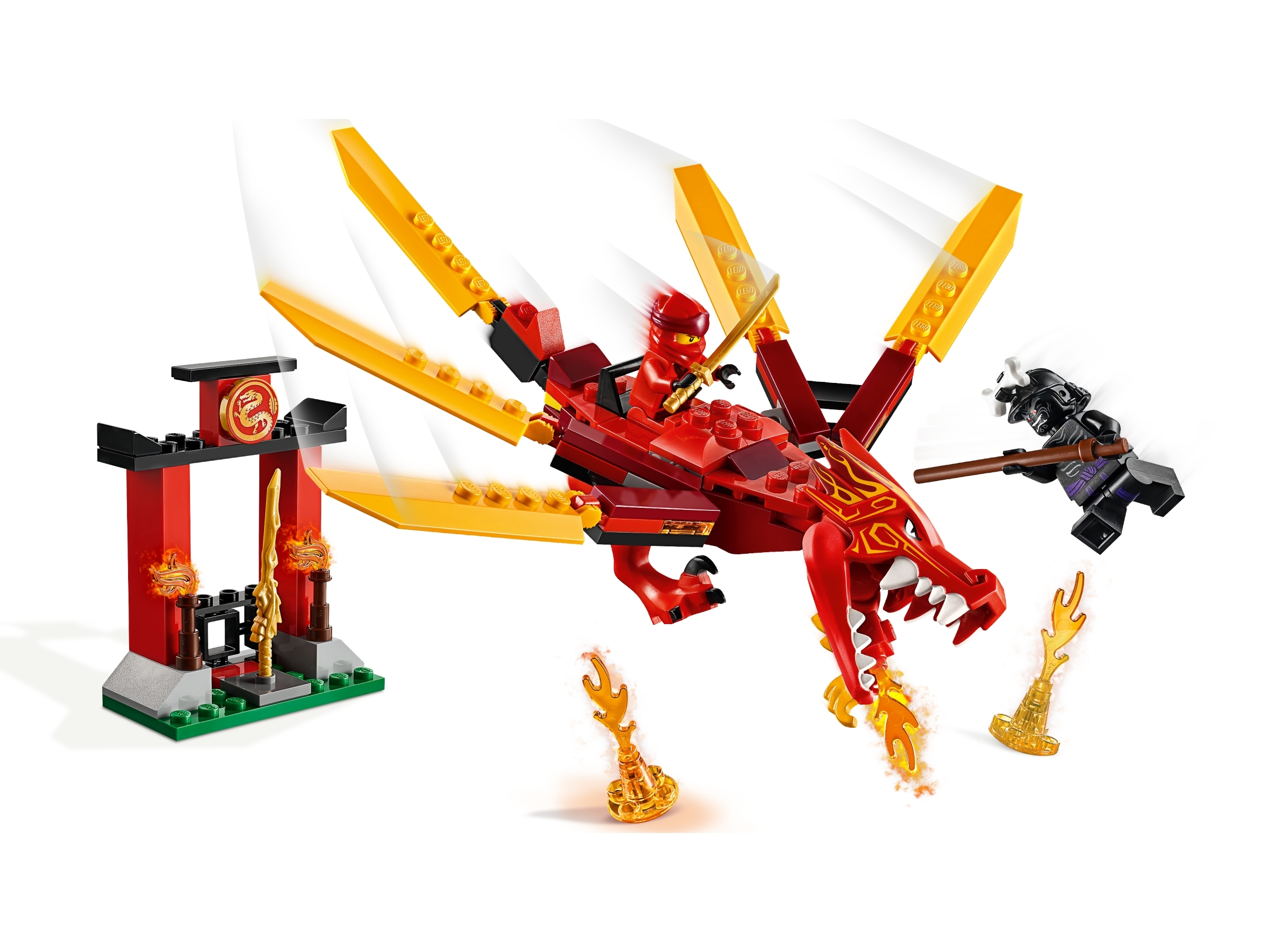 • Der rote Spielzeug-Drache kann seine Beine und Flügel sowie seinen Kopf, seinen Schwanz und sein Maul bewegen, um Kai gegen Lord Garmadon beizustehen. Kinder können sich Geschichten ausdenken und versuchen, das Schwert des Feuer zu beschützen.