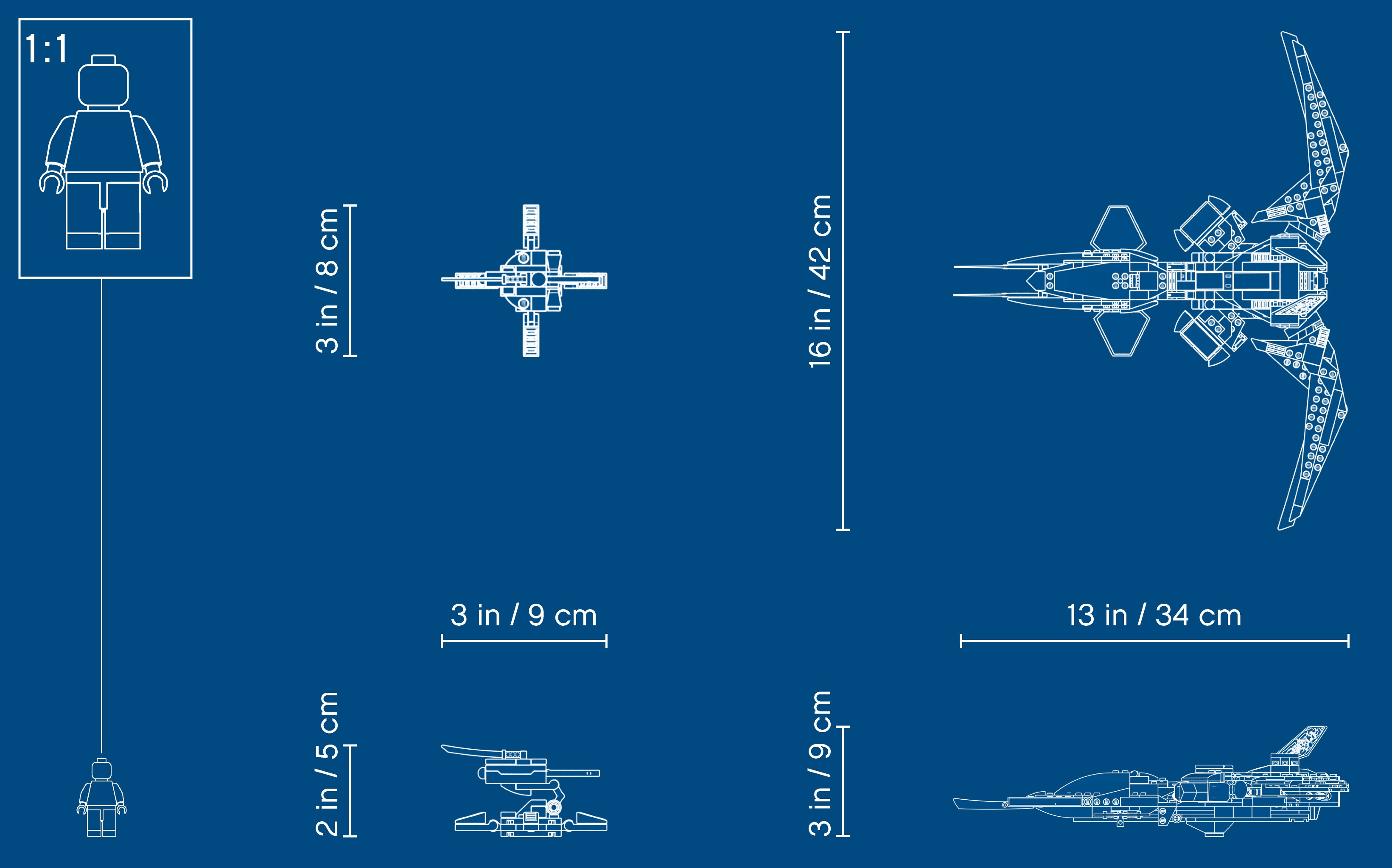Dieses LEGO® NINJAGO® Legacy Set besitzt die perfekte Größe, um Kinder daheim oder unterwegs zu beschäftigen. Der Spielzeug-Jet ist 13 cm hoch, 34 cm lang und 43 cm breit.