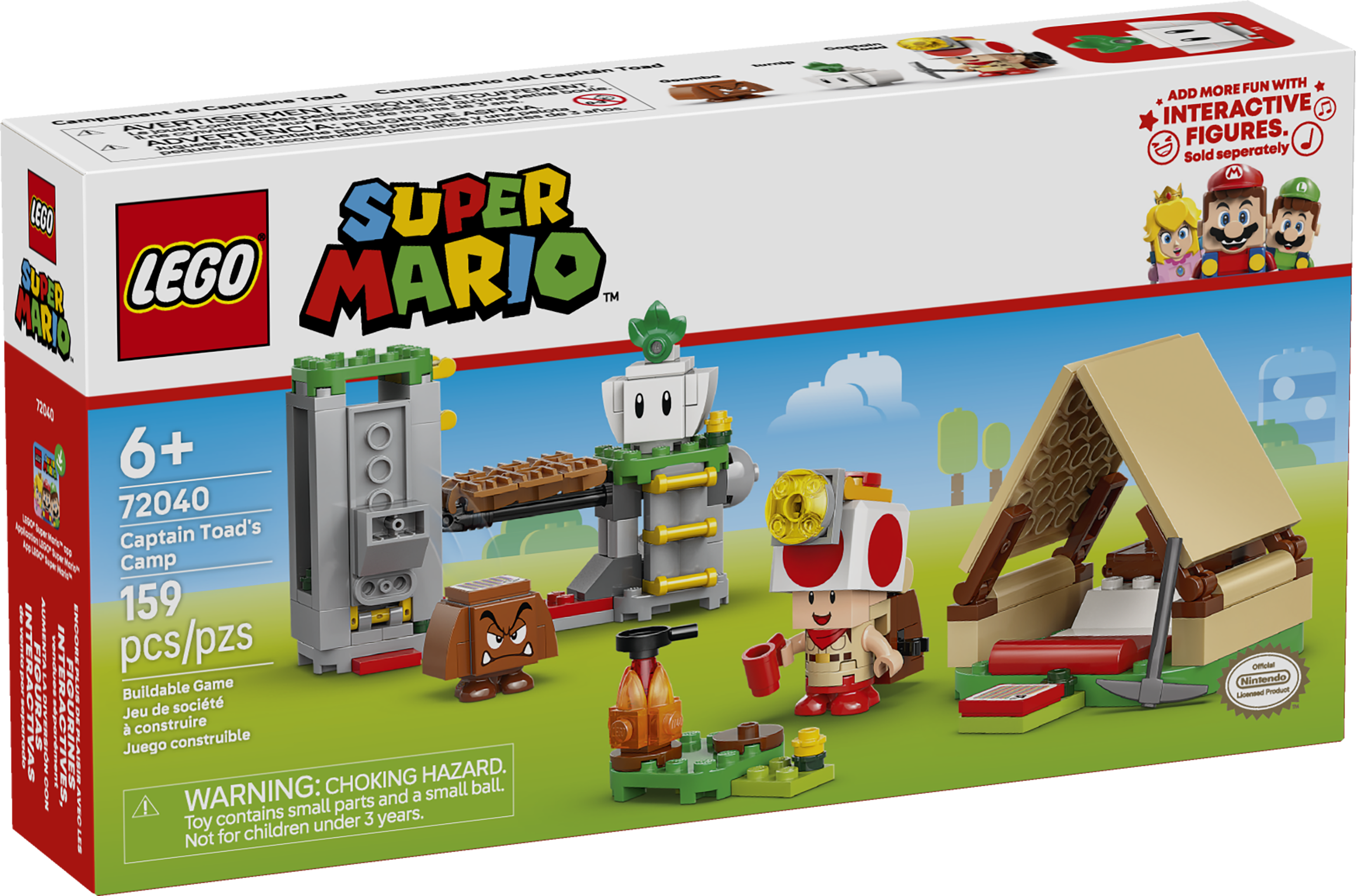 Dieses LEGO® Super Mario™ Spielset (72040) lässt Kinder das Kapitän Toad-Camp erkunden und einen versteckten Schatz suchen. Dieses Bauspielzeug ist ein fantastisches kleines Geschenk für Jungen, Mädchen und alle Fans ab 6 Jahren. Das Bauset beinhaltet ein baubares Zelt mit Lagerfeuer für Kapitän Toad, eine einstürzende Brücke, versteckte Diamanten und eine Schatztruhe. 3 LEGO Super Mario Figuren – Kapitän Toad, ein Gumba und eine Rübe – laden ebenso zu kreativen Rollenspielen ein wie der baubare Rucksack, eine Spitzhacke und eine Pfanne. Für ein interaktives Spielerlebnis muss man nur LEGO® Mario™, LEGO® Luigi™ or LEGO® Peach™ aus den separat erhältlichen Sets 71439, 71440, 71441 oder 72043 hinzufügen. Diese Charaktere zeigen digitale Reaktionen, wenn sie auf den Funktionsstein des Zeltes hüpfen und den Gumba besiegen. Bauanleitungen zu diesem LEGO Nintendo® Set findest du in der Box oder in der LEGO Super Mario App. Schau dir auch unbedingt die anderen separat erhältlichen LEGO Super Mario Sets an. Dieses Set besteht aus 159 Teilen.