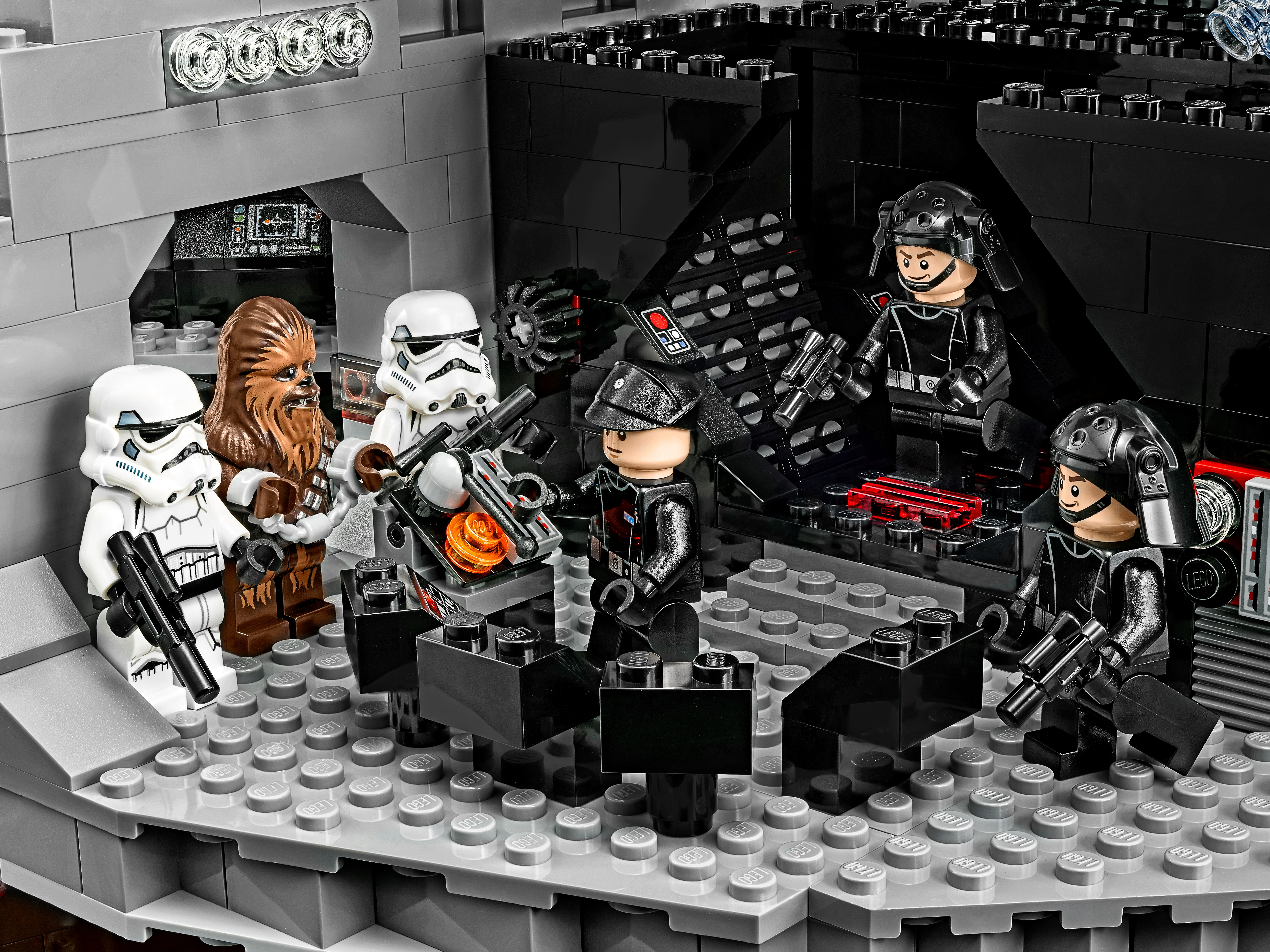 Enthält 23 Minifiguren: Grand Moff Tarkin, Darth Vader, Imperator Palpatine, Imperial Navy Officer, Imperial Officer, 2 Stormtrooper, 2 Death Star Trooper, 2 Königliche Wachen des Imperators, 2 Death Star Droids, Obi-Wan Kenobi, Chewbacca, Prinzessin Leia, C-3PO, Han Solo, Han Solo (maskiert), Luke Skywalker (Tatooine), Luke Skywalker (maskiert) und Luke Skywalker (finales Duell) sowie R2-D2, einen Imperial Astromech und das Müllpressenmonster Dianoga.