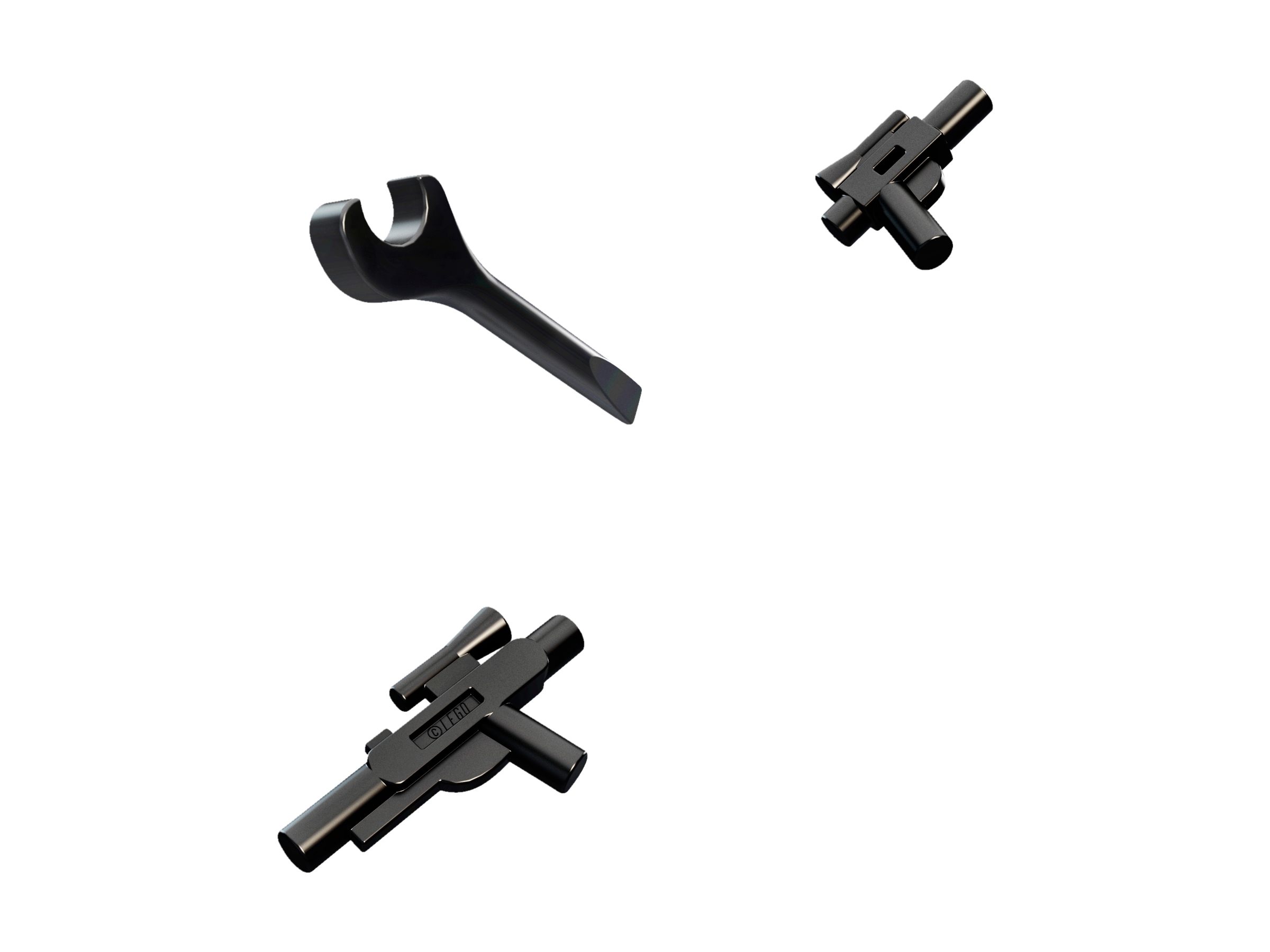 Als Zubehör sind ein Schraubenschlüssel und ein Brecheisen enthalten.