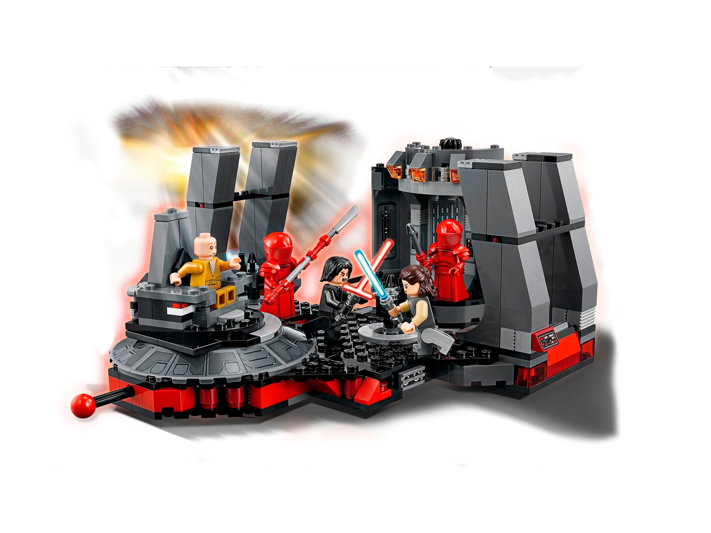 Lass Supreme Leader Snoke, Rey, Kylo Ren und die bestens ausgebildeten Elite Praetorian Guards im LEGO® Star Wars Set „Snokes Thronsaal“ (75216) die Kräfte messen! Die spannende Szene aus dem Film „Star Wars: Die letzten Jedi“ diente diesem LEGO Star Wars Set als Vorbild, das den Thronsaal an Bord von Snokes Star Destroyer mit drehbarem Thron, Funktionen zum Betätigen der Drehtür und des Gleitbodens, Geheimfächer für Snokes Schätze und Ausrüstung sowie 5 LEGO Minifiguren enthält.