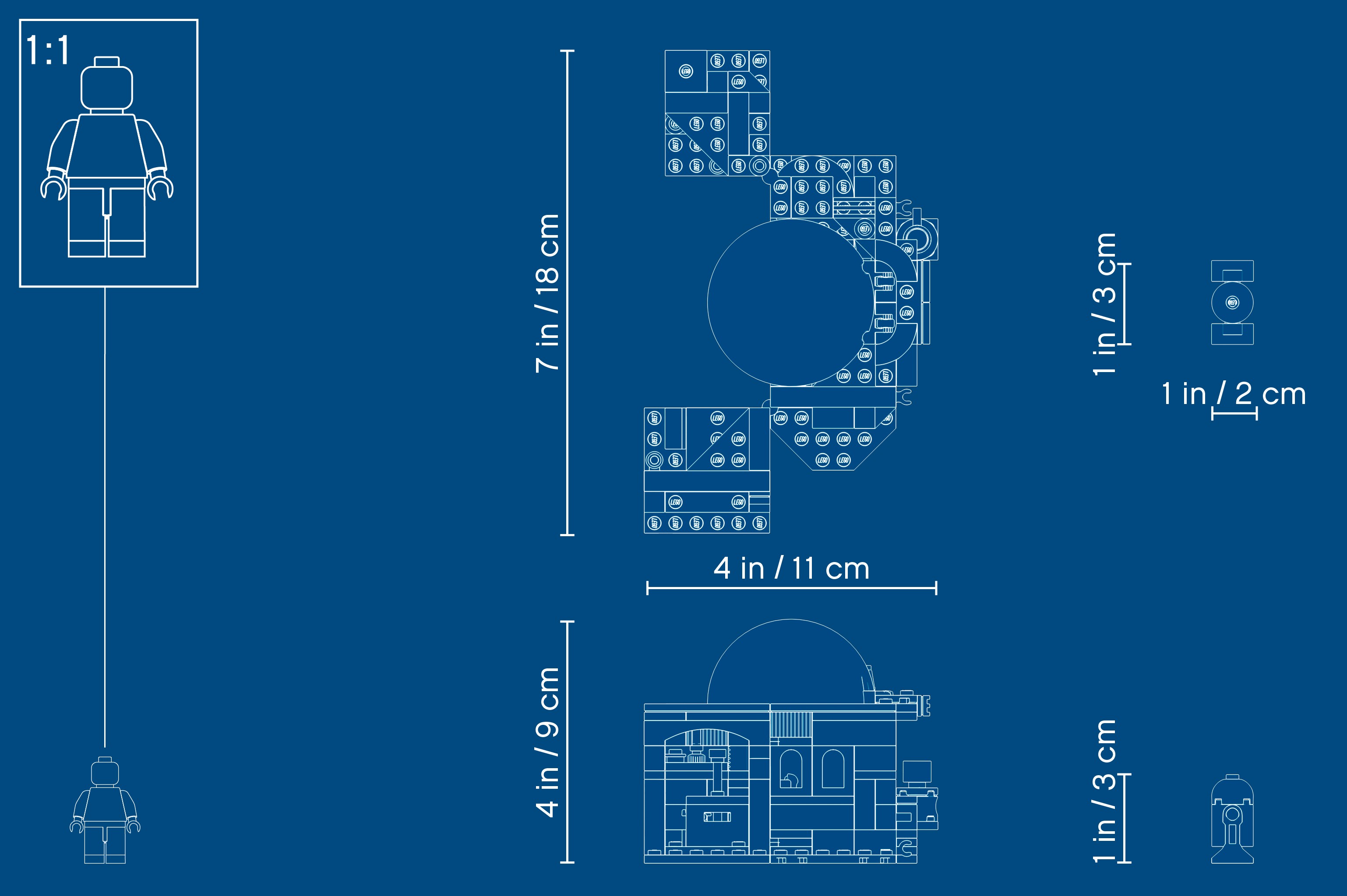 Zugeklappt ist Obi Wans Hütte auf Tatooine 9 cm hoch, 12 cm breit und 11 cm tief. Das Modell ist folglich kompakt genug, um neben den Star Wars™ Minifiguren in einer Tasche verstaut zu werden und die Kinder unterwegs zu beschäftigen.