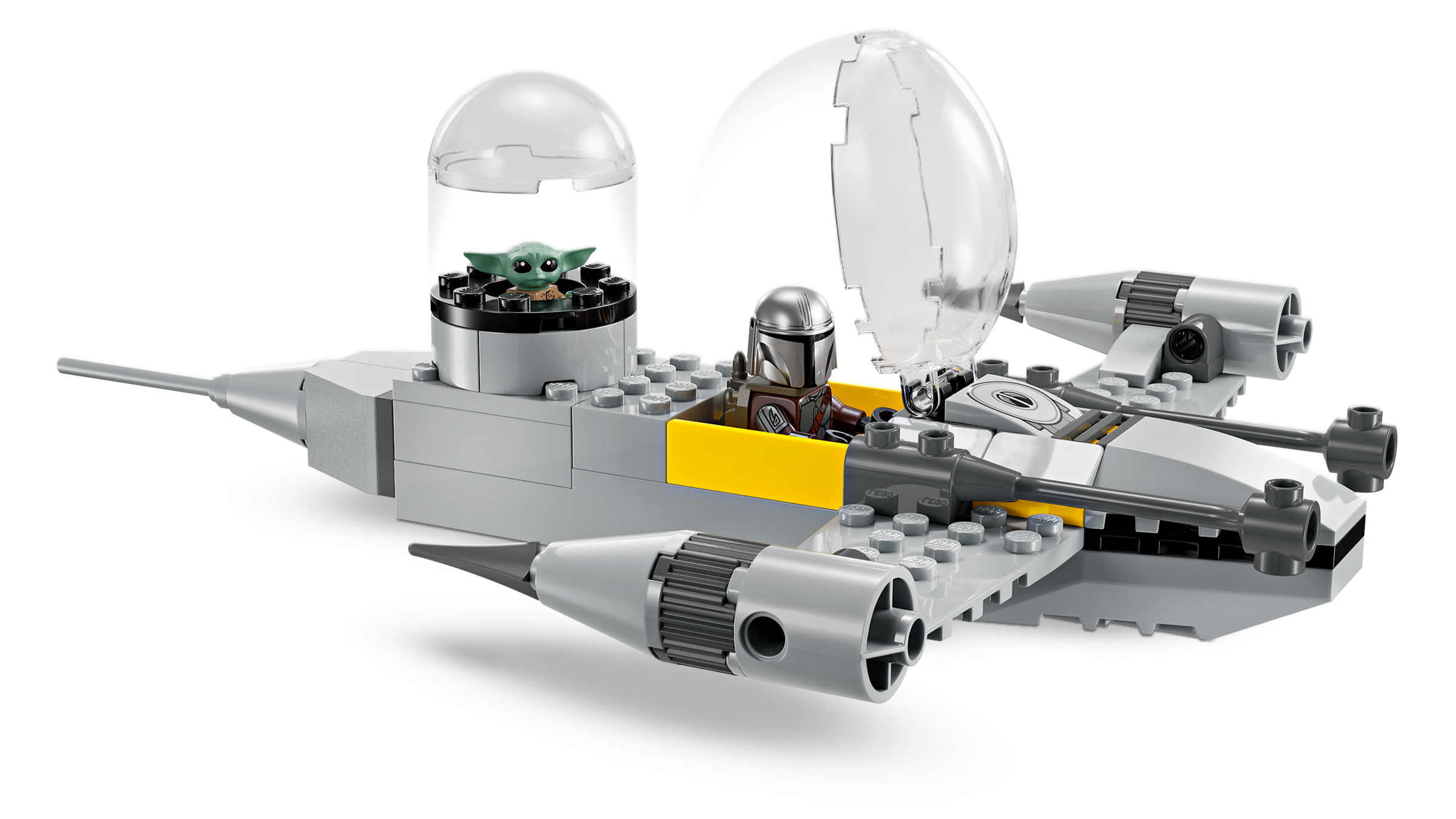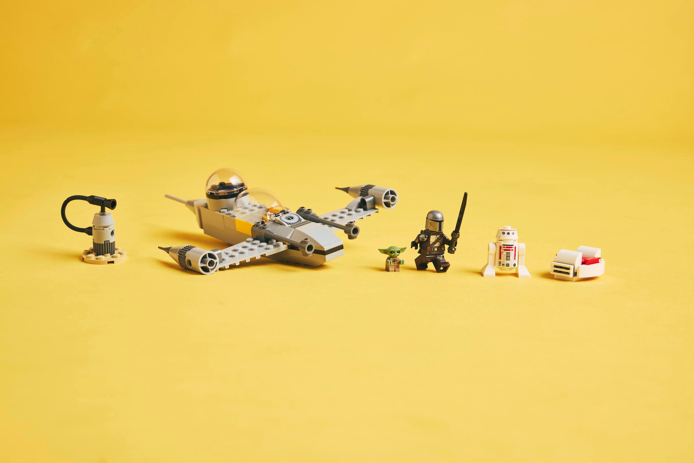 Neben dem Modell des N-1 Starfighters beinhaltet das Bauset auch 3 LEGO Star Wars Charaktere: den Mandalorianer mit Dunkelschwert und Raketenrucksack, Grogu in seiner Repulsorwiege sowie R5-D4. Setz Mando in das aufklappbare Cockpit des N-1 Starfighters. Und Grogu kann im Heck Platz nehmen.