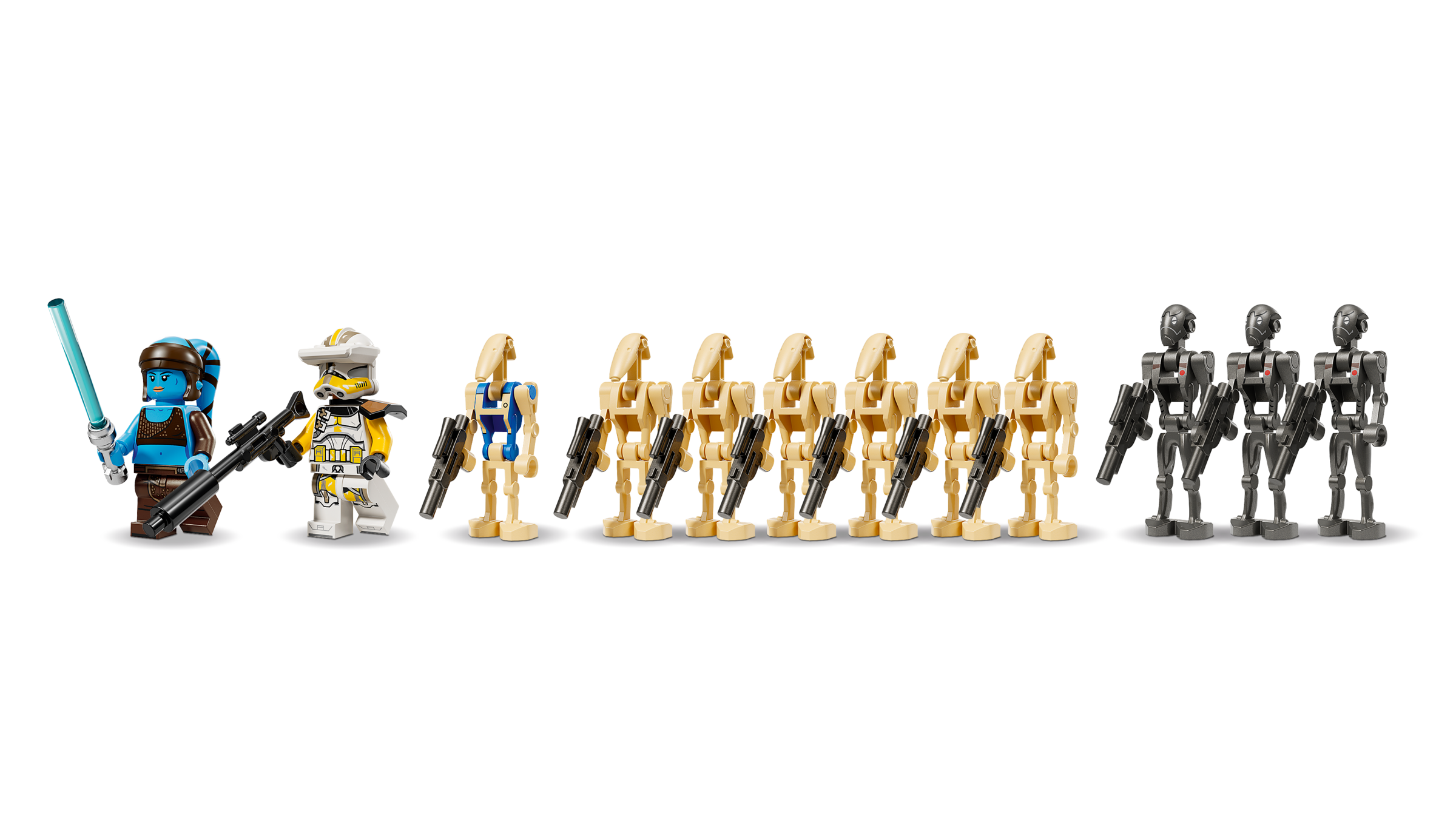 Dieses Set ist ein cooles Star Wars Geschenk für Kinder. Zum Set gehören auch 2 LEGO Minifiguren – Aayla Secura mit einem Lichtschwert und Kommandant Bly mit einem Blaster-Gewehr. Auch zehn weitere LEGO Figuren (3 Kommandodroiden, 6 Kampfdroiden und 1 Kampfdroidenpilot) mit Blastern laden zum Spielen ein. Das Set besteht aus 976 Teilen.