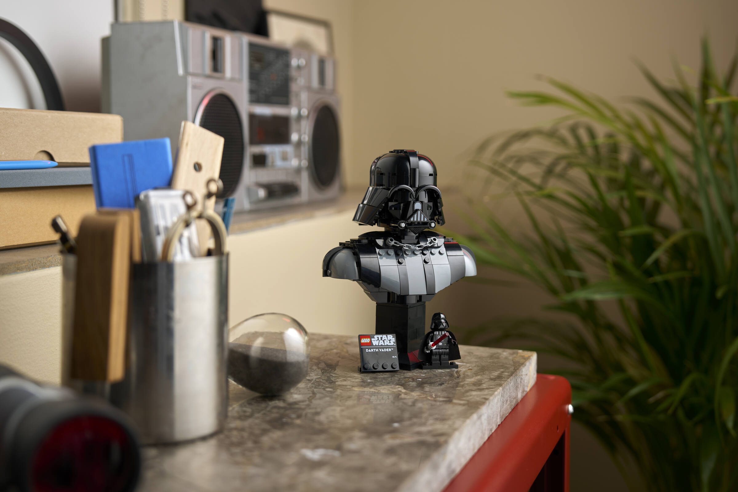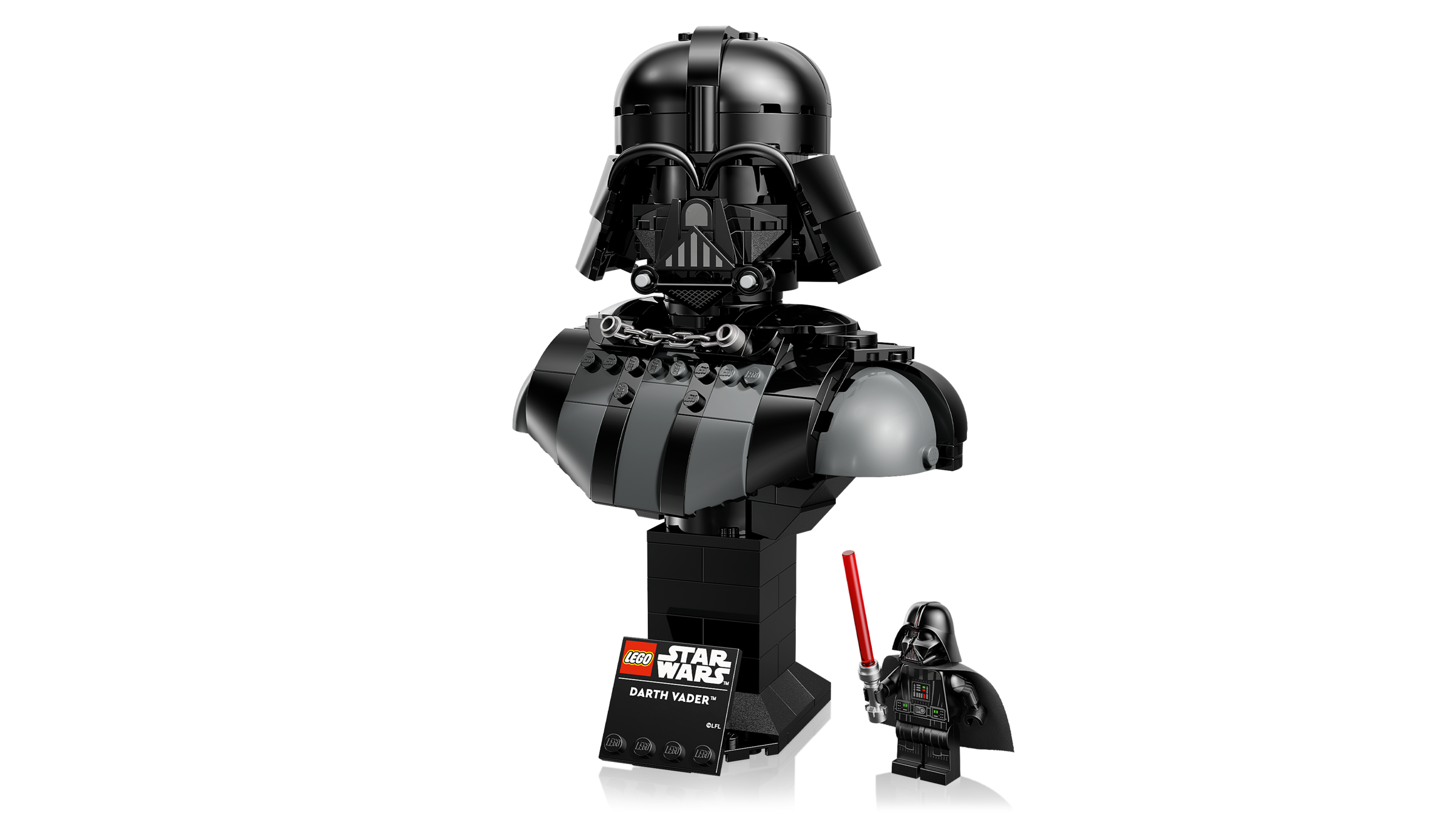 MODELL ZUM AUSSTELLEN: Stell deine Büste auf dem baubaren Ständer (mit Namensschild) neben der LEGO® Minifigur Darth Vader aus und dreh die Büste auf dem Ständer, um sie aus jedem Winkel zu betrachten