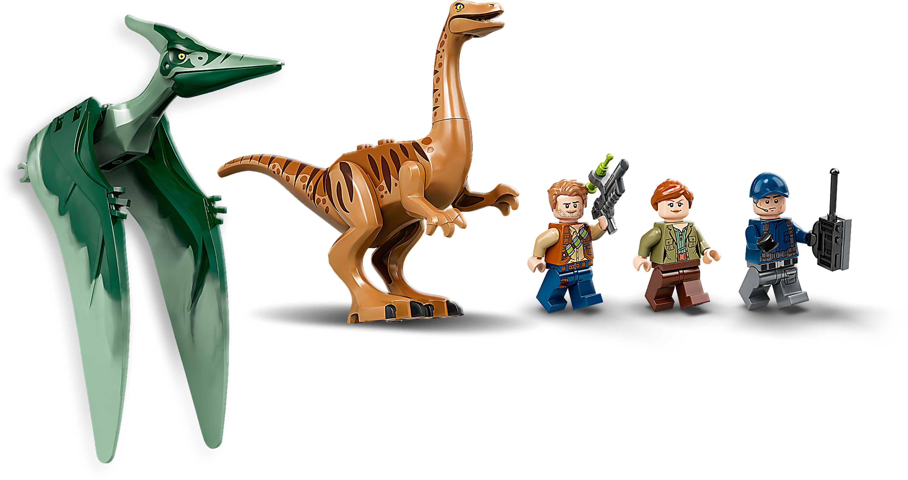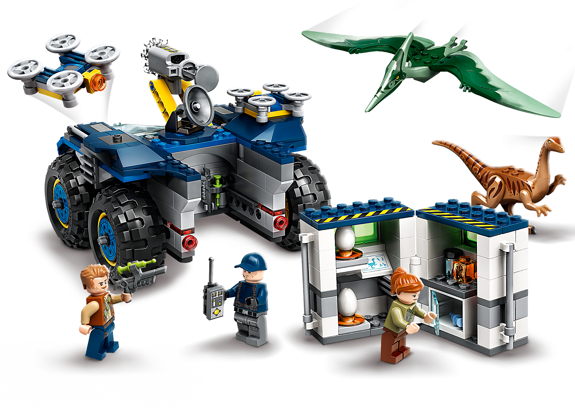 • Das Set enthält 3 LEGO® Minifiguren – Owen Grady, Claire Dearing und einen ACU-Ranger – sowie einen Gallimimus und ein Pteranodon als bewegliche Spielzeugfiguren (neu ab Juni 2020), die mit dem Netzwerfer am Forschungsfahrzeug eingefangen werden können.