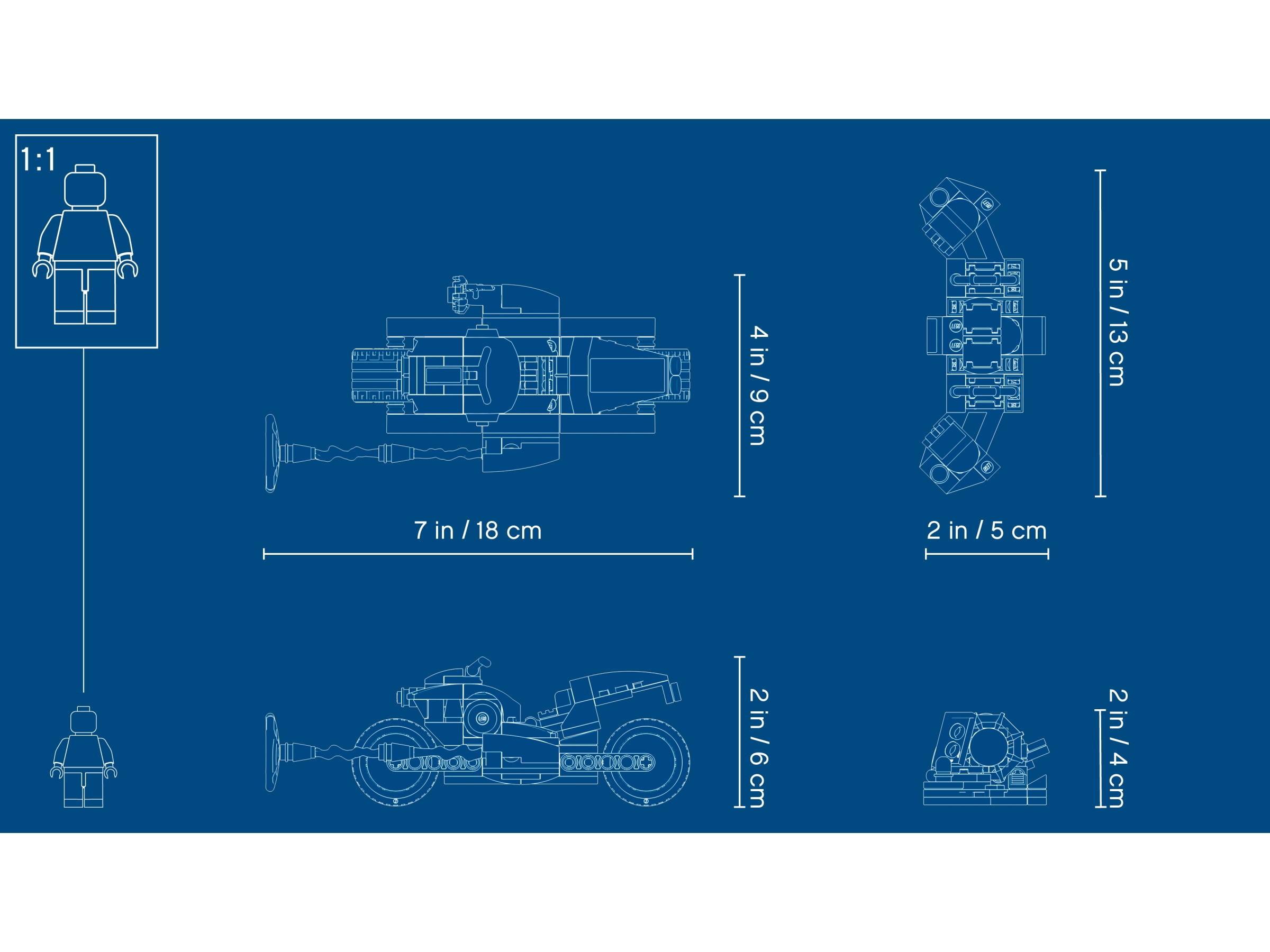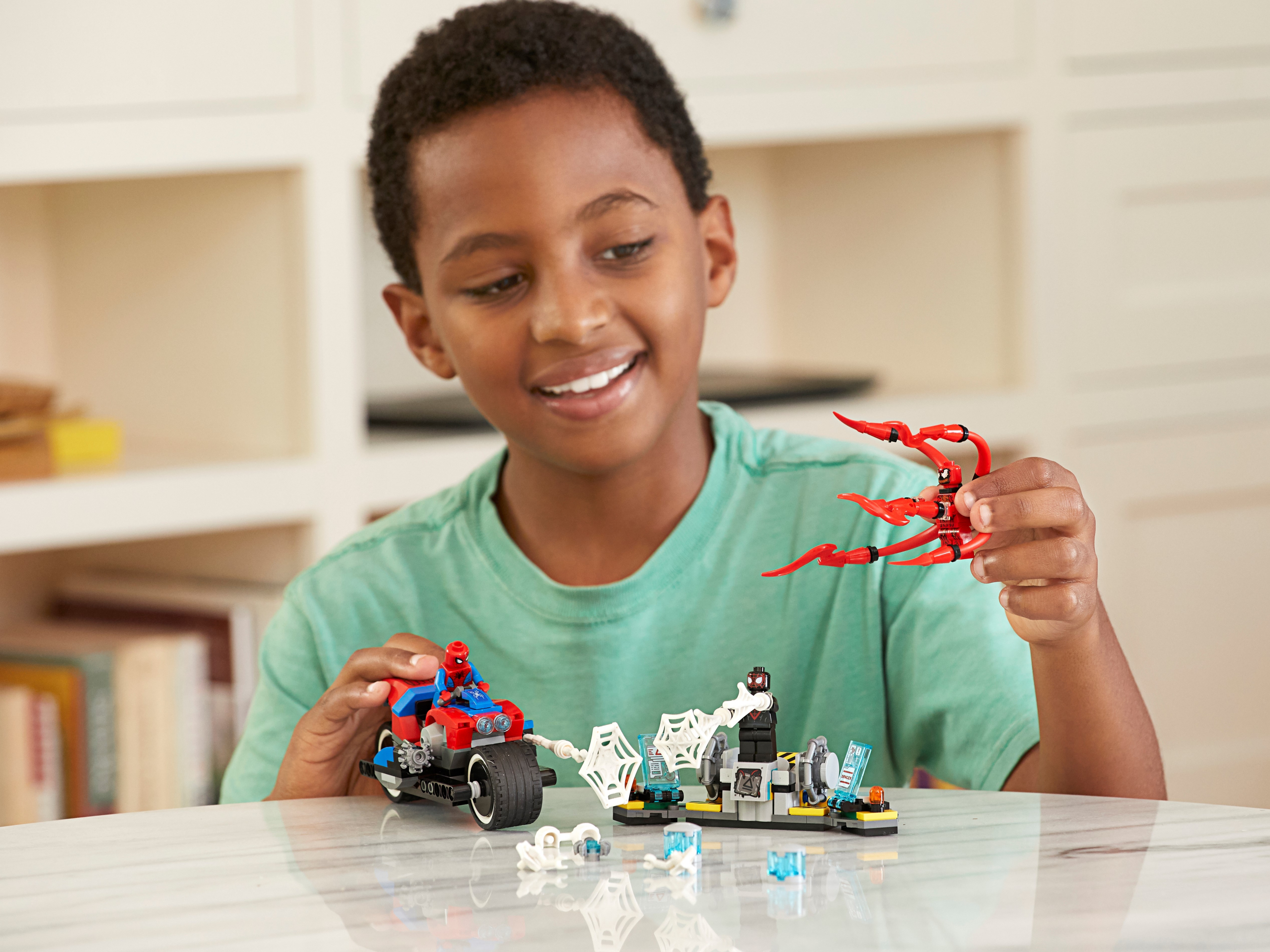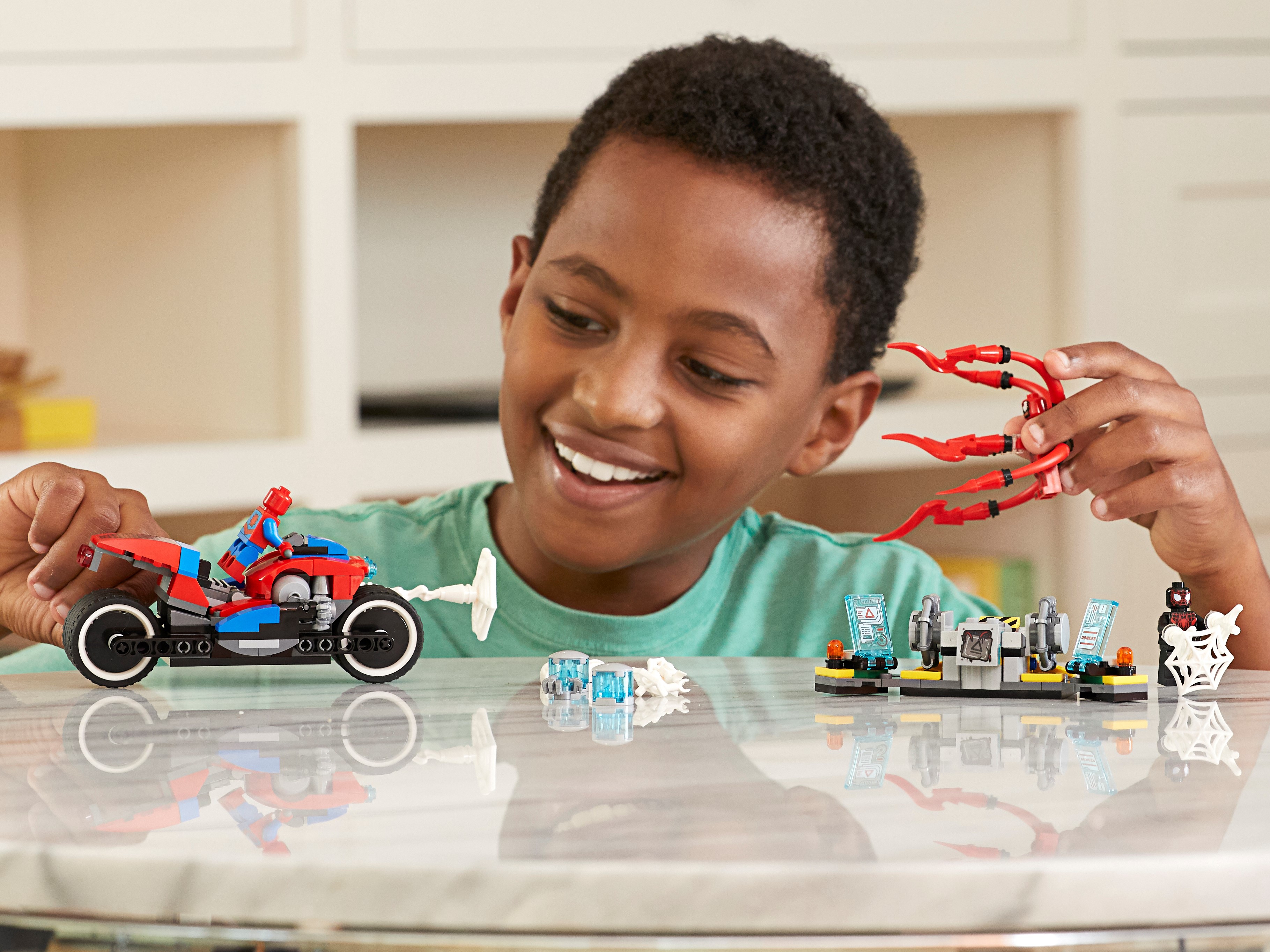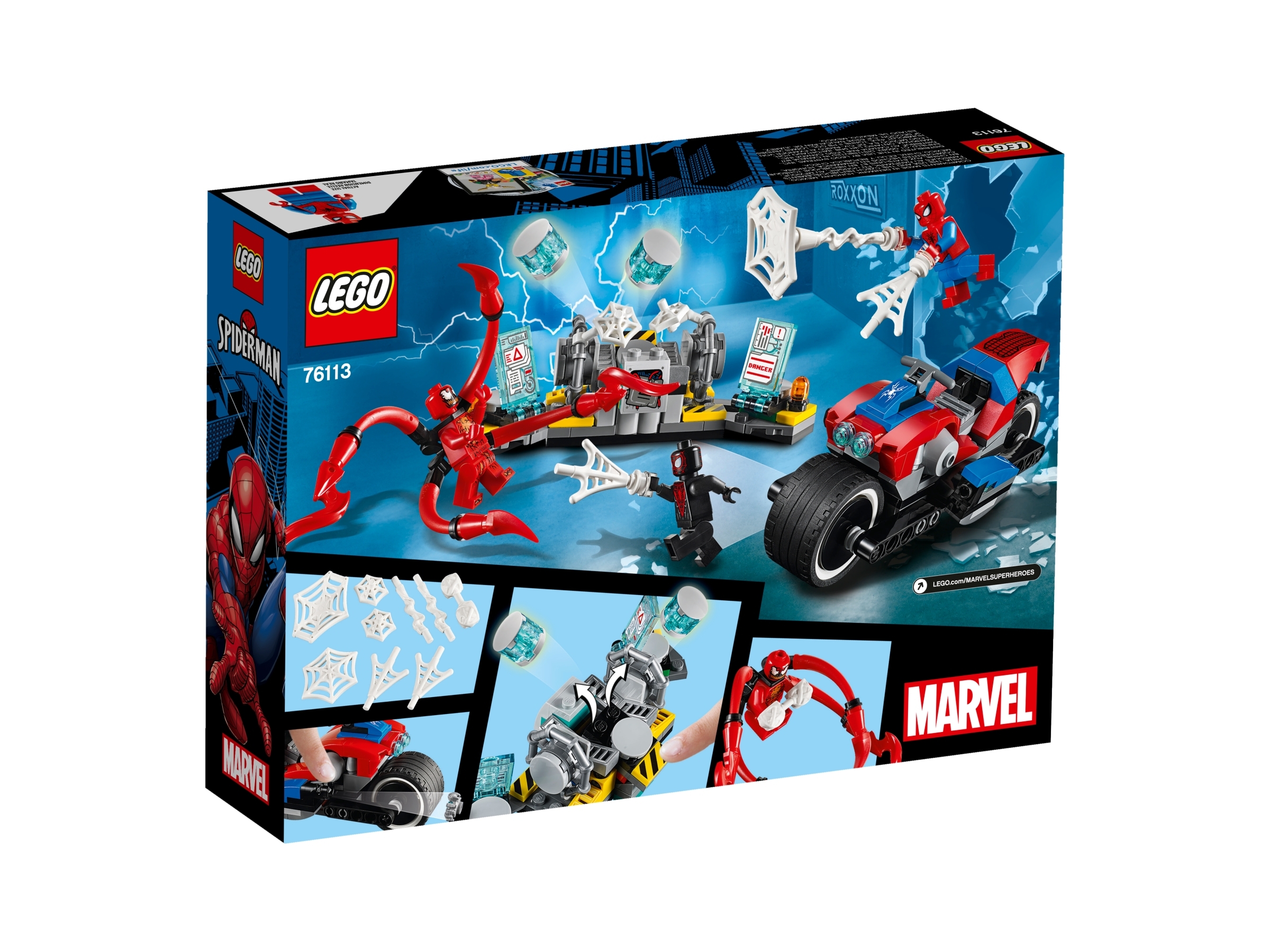 Rase mit dem LEGO® Marvel Spider-Man Set „Spider-Man Motorradrettung“ (76113) durch die Straßen von New York City und hilf Spider-Man und Miles Morales, den Plan vom bösen Carnage zu vereiteln, den Stromgenerator in die Luft zu jagen. Dieses actiongeladene Konstruktionsspielzeug umfasst ein Spider-Man Motorrad mit einem Technikspinnen-Shooter und einer Netzpistole (kann nicht abgefeuert werden) sowie einen baubaren Stromgenerator mit Explosionsfunktion. Darüber hinaus sind 3 LEGO Minifiguren und 9 verschiedene Netzelemente enthalten, mit denen du deine Modelle, Minifiguren und Ausrüstung zum kreativen Spielen anpassen kannst.