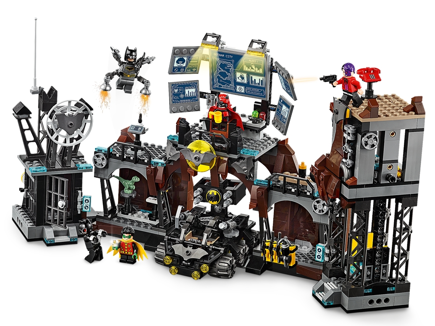 Das Set umfasst das LEGO® Bathöhlen-Spielzeug mit Batcomputer-Bereich, Hightech-Bereich, Trainingsbereich, Ausrüstungsraum, Trophäenraum und abnehmbaren Transformationsturm- und Gefängnismodulen sowie einen Bat-Tank™.