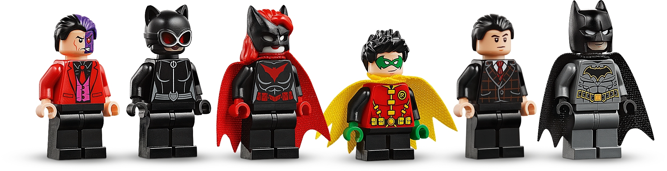 Das LEGO® Batman™ Spielset enthält 6 Minifiguren: Batman, Bruce Wayne™, Robin™, Batwoman™, Catwoman™ und Two-Face™ sowie eine große, bewegliche Clayface™ Figur mit Schnappmaul und Greifhänden, die eine Minifigur halten können.