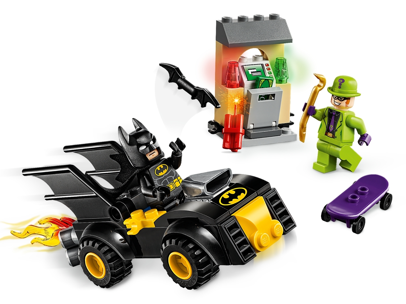 Zum Zubehör gehören das baubare Skateboard und das Brecheisen vom Riddler™.