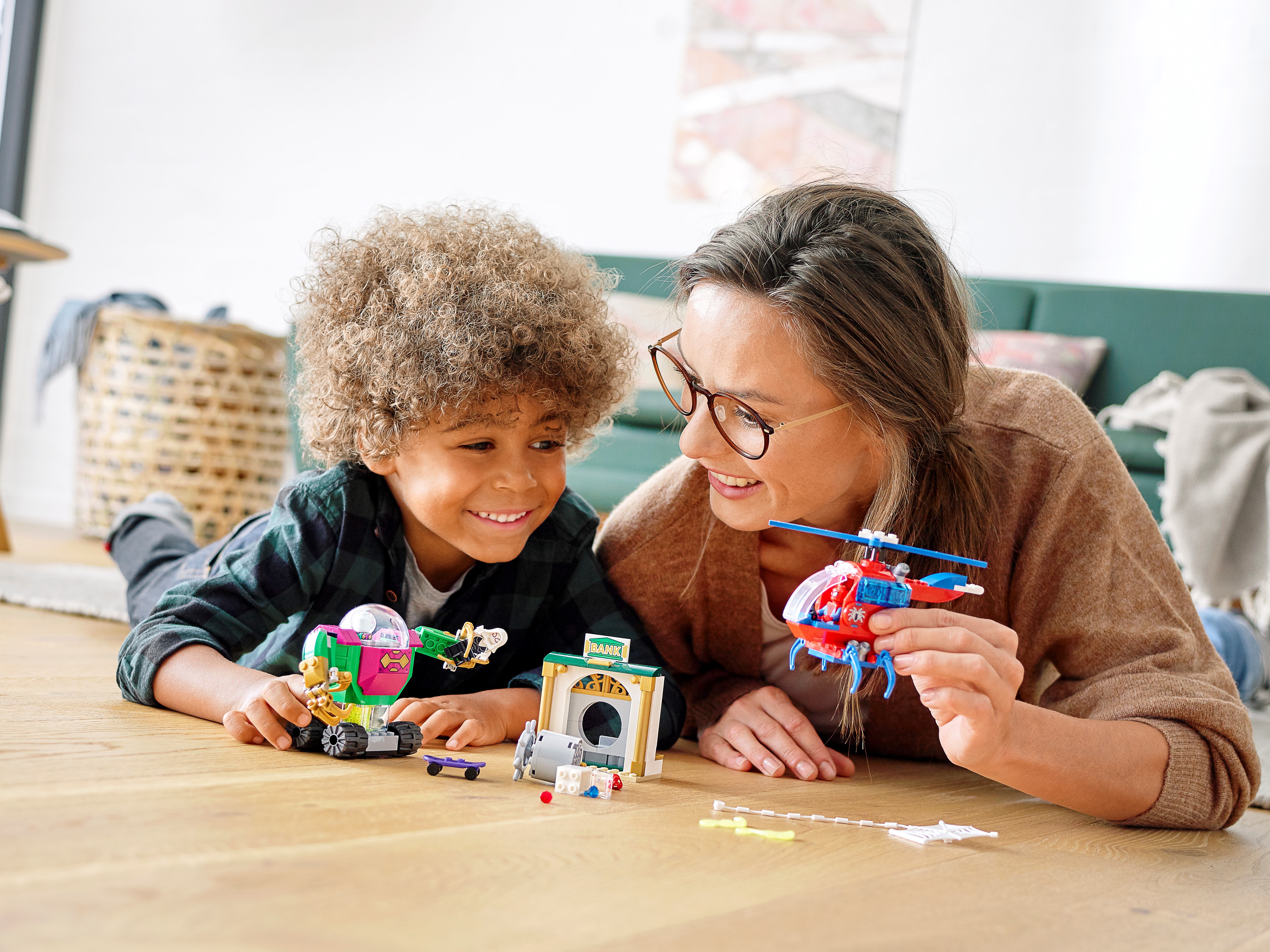Dieses Superhelden-Spielset enthält neben Spider-Man, Ghost Spider und Mysterio als LEGO Minifiguren auch den Spider-Copter und den Mysterio Mech! Der Mech hat Räder und bewegliche Arme zum Aufbrechen des Tresorraums. Mit der Greifklaue an Spider-Mans Hubschrauber können sich die Kinder Mysterio schnappen – und den Mech mit dem Netz fangen. Die einfache Bauanleitung erklärt jeden Schritt, und mit der interaktiven LEGO Life App zum Herunterladen lässt sich die digitale Modellansicht vergrößern und drehen.