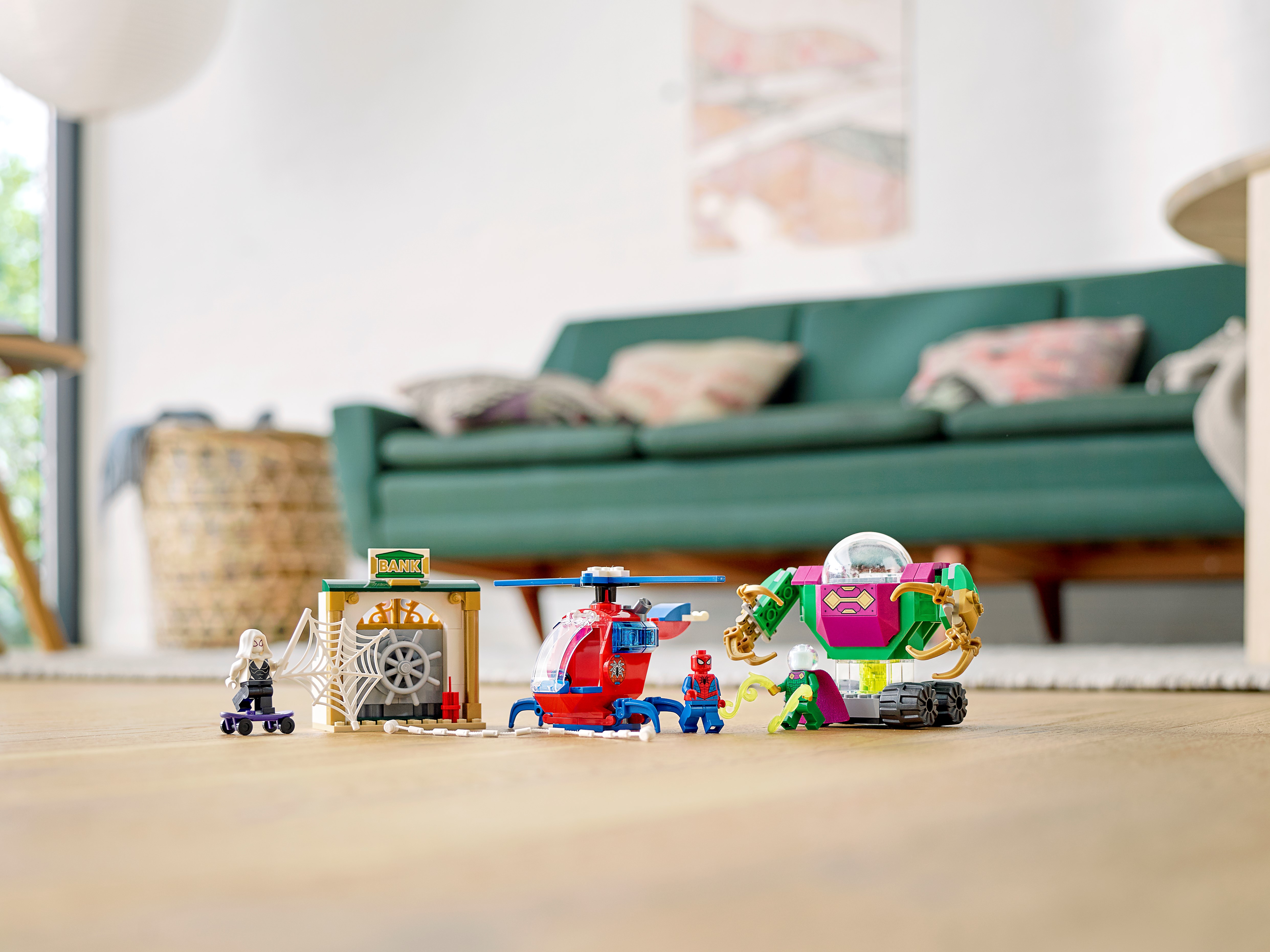 Dieses coole Action-Spielzeug enthält drei Minifiguren: Spider-Man, Ghost Spider und Mysterio. Ebenfalls enthalten sind Spider-Mans Hubschrauber, Mysterios Mech und eine Bank mit Tresorraum!