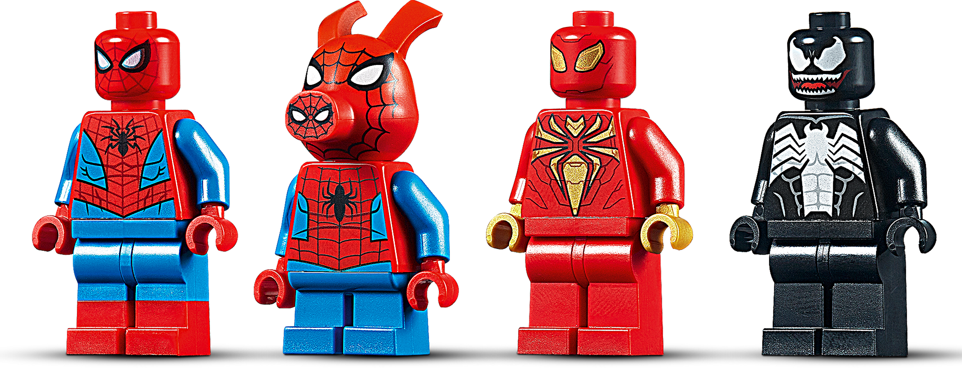 • Kinder stellen ihre Lieblingsszenen aus den Marvel-Filmen nach und denken sich eigene Abenteuer mit den Minifiguren Spider-Man, Iron Spider, Spider-Ham und Venom aus, die um das Venom-Ei ringen – in dem sich ein Skelett befindet.
