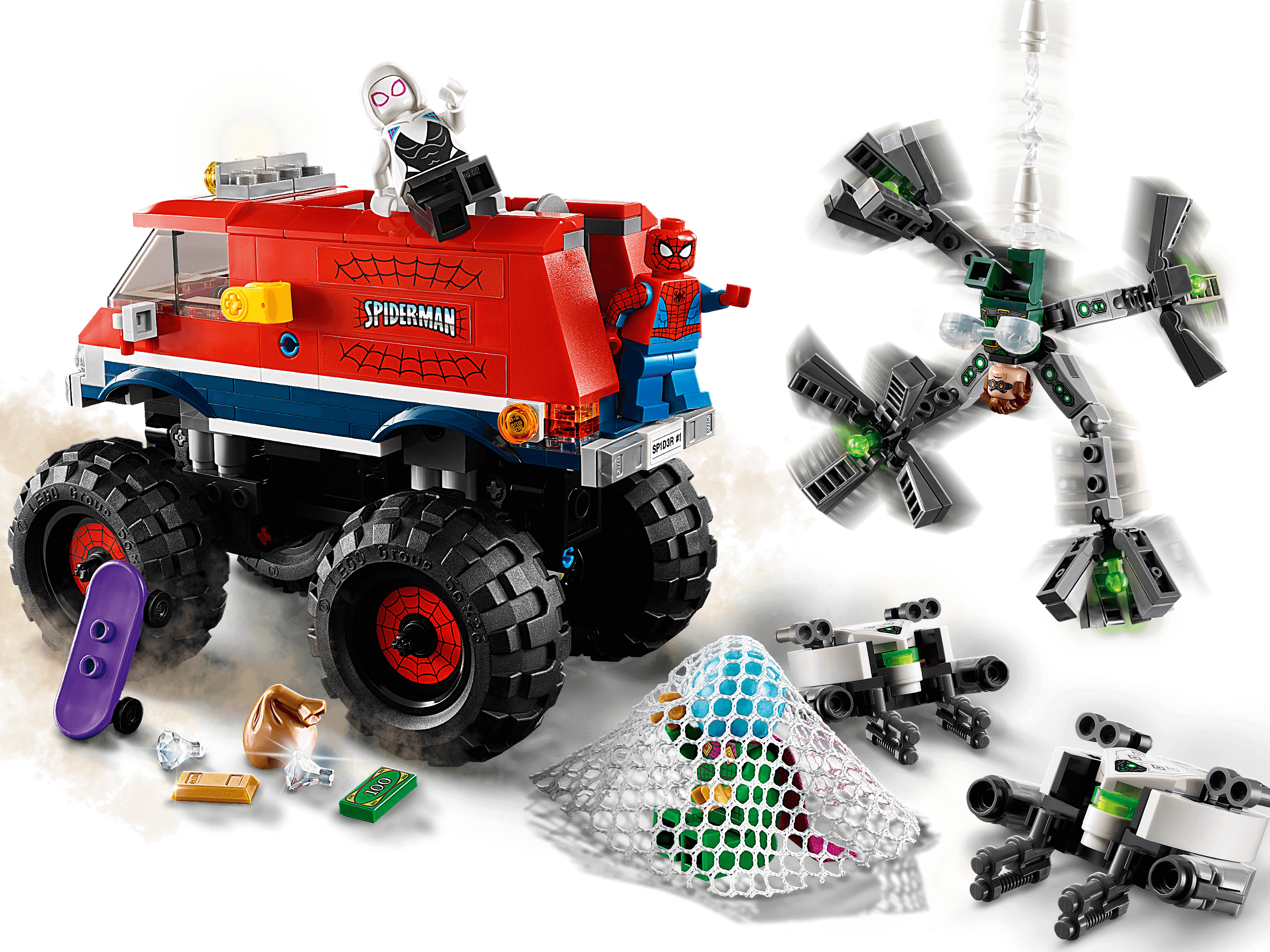 • Enthält Spider-Man, Doctor Octopus, Mysterio und Spider-Gwen als Minifiguren, einen Monstertruck mit Superfederung und Netzwerfer auf dem Dach sowie 2 baubare Drohen mit je 2 Shootern.