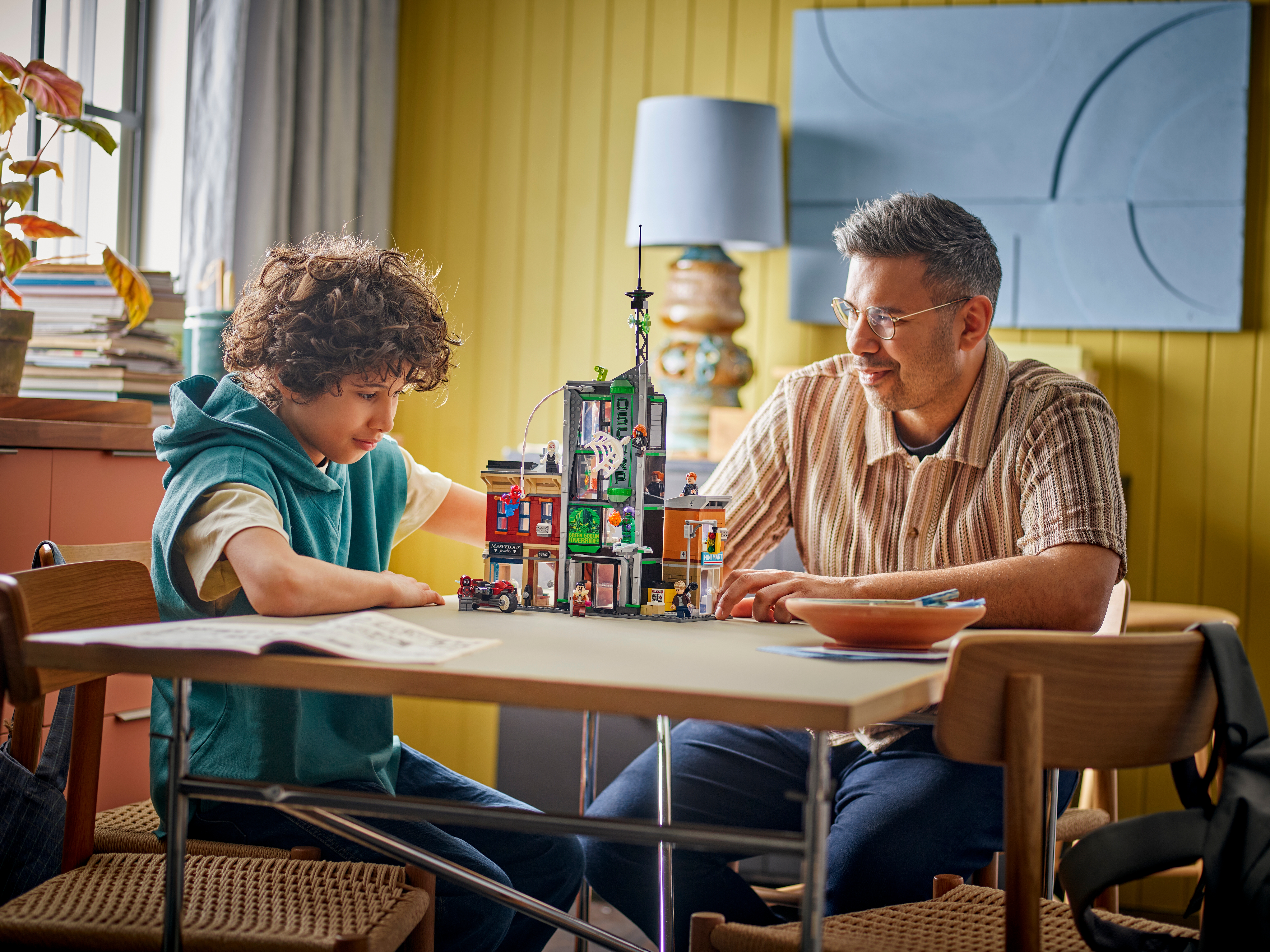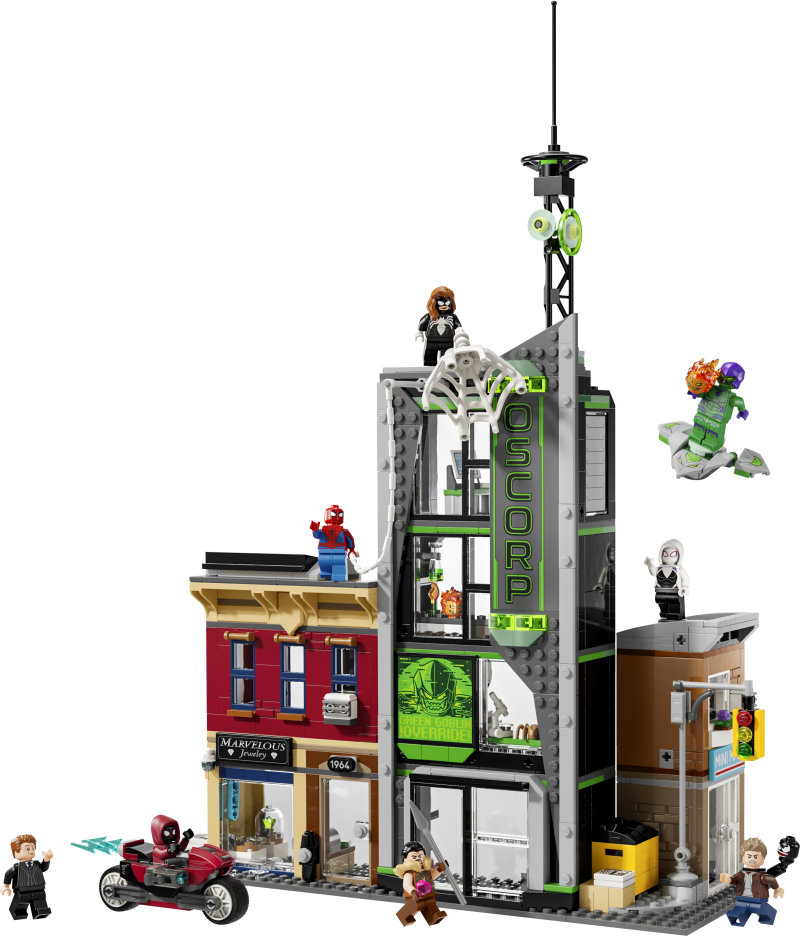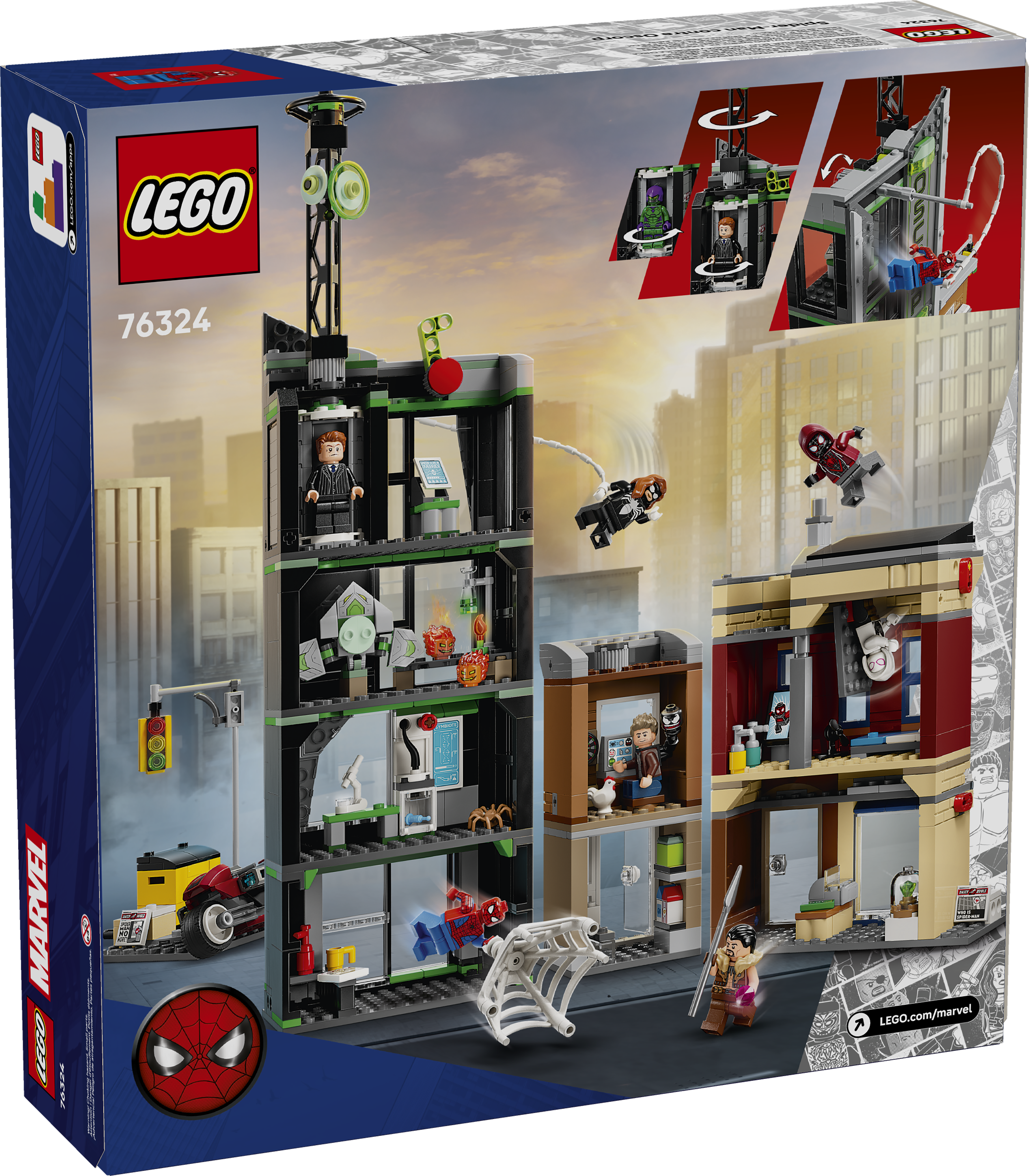 Die Straßenkulisse besteht aus 3 separaten Gebäuden: Miles Morales’ Wohnung mit dem darunter befindlichen Juweliergeschäft, dem Oscorp-Gebäude und Venoms Wohnung mit Mini-Markt im Erdgeschoss. Jedes Zimmer ist mit passenden Möbeln, Geräten und Zubehörelementen eingerichtet. 8 LEGO Minifiguren aus den Marvel-Filmen garantieren jede Menge Actionspaß: Spider-Man, Spider-Woman, Miles Morales auf seinem Motorrad, Eddie Brock, Ghost-Spider, Norman Osborn, Kraven der Jäger und Green Goblin auf seinem Gleiter. Kinder können die Charaktere an durchsichtigen Stäben befestigen, um sie „schweben“ zu lassen. Das gemeinsame Bauen mit der LEGO Builder App bietet Freunden und der Familie ein tolles Gemeinschaftserlebnis. Das Set besteht aus 808 Teilen.