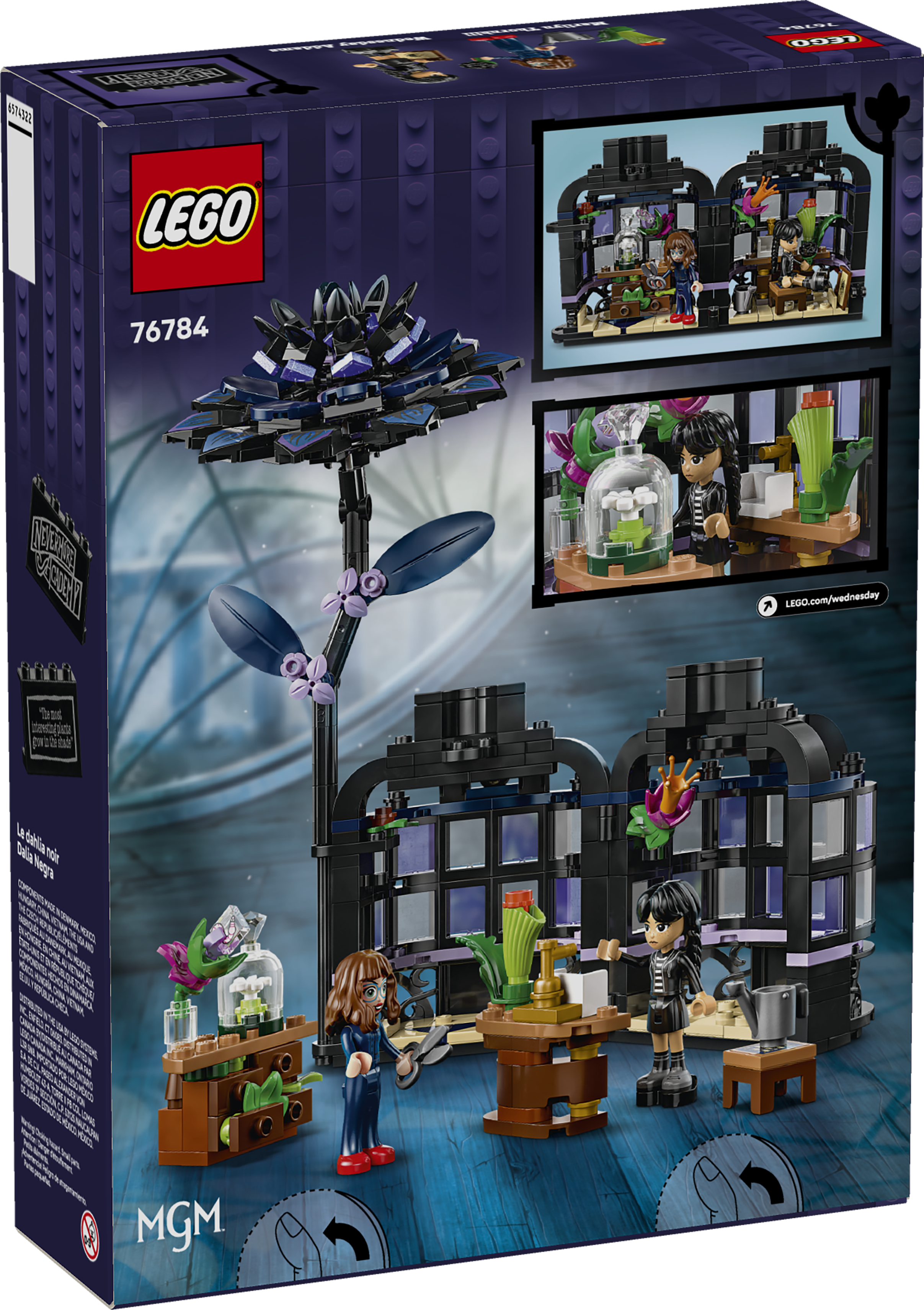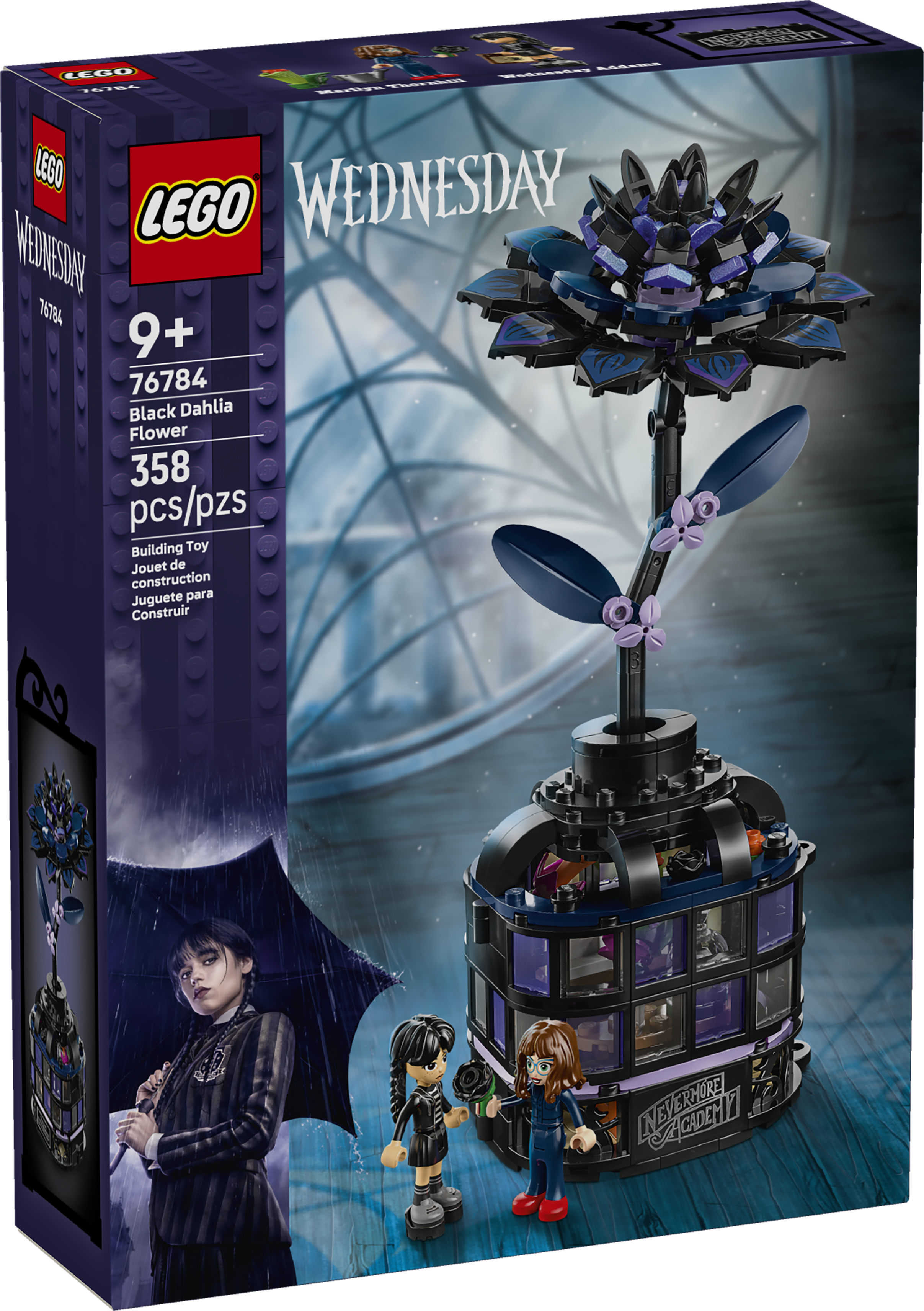 LEGO® Wednesday Schwarze Dahlie (76784) ist ein Bauspielzeug und ein elegantes Ausstellungsstück für Botanik- und Designfans ab 9 Jahren. Diese Zimmerdeko besteht aus einer schwarzen Dahlie mit Blättern und hellvioletten Knospen und einer Vase, die einem Mini-Wintergarten nachempfunden ist. Kinder können die Dahlie von dem fertigen Modell abnehmen, um die Vase zu entriegeln und das im Inneren versteckte Klassenzimmer zu entdecken. Im Klassenzimmer stehen herausnehmbare Schreibtische, ein Hocker und weiteres Zubehör für viele Geschichten. Und die beiden Spielfiguren Wednesday Addams und Marilyn Thornhill (Wednesdays Botaniklehrerin) laden zu unzähligen Rollenspielen ein.