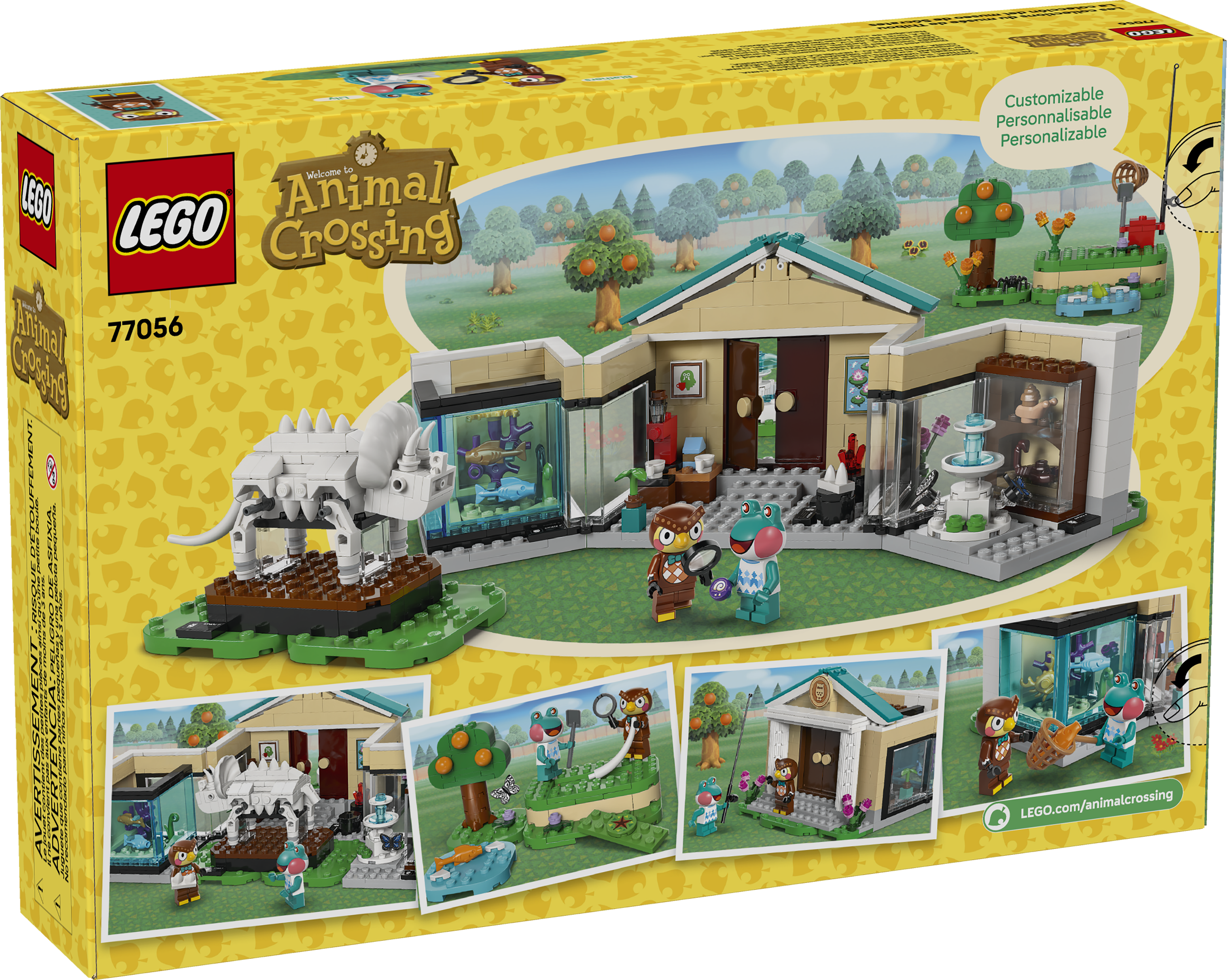 Dieses LEGO® Bauspielzeug bildet das Museum aus der Videospielreihe Animal Crossing nach. Kinder können die verschiedenen Ausstellungsbereiche mit ihren Funden individuell gestalten. Mit dem Spaten kann man den fehlenden Triceratops-Schwanzknochen ausgraben. Mit dem Netz kann man Fische fürs Aquarium oder Schmetterlinge und Krabbeltiere fangen. Klappwände und umstellbare Elemente lassen sich anders anordnen und bieten weitere Spielmöglichkeiten. Zum Set gehören auch ein Springbrunnen und das Café Taubenschlag, in dem Kinder Eugen und Liliane treffen können, bevor sie die Natur weiter erkunden. Außerdem bietet die LEGO Builder App zusätzlichen digitalen Bauspaß. In der App können junge Baumeister 3D-Modellansichten vergrößern und drehen. Das Set besteht aus 543 Teilen.