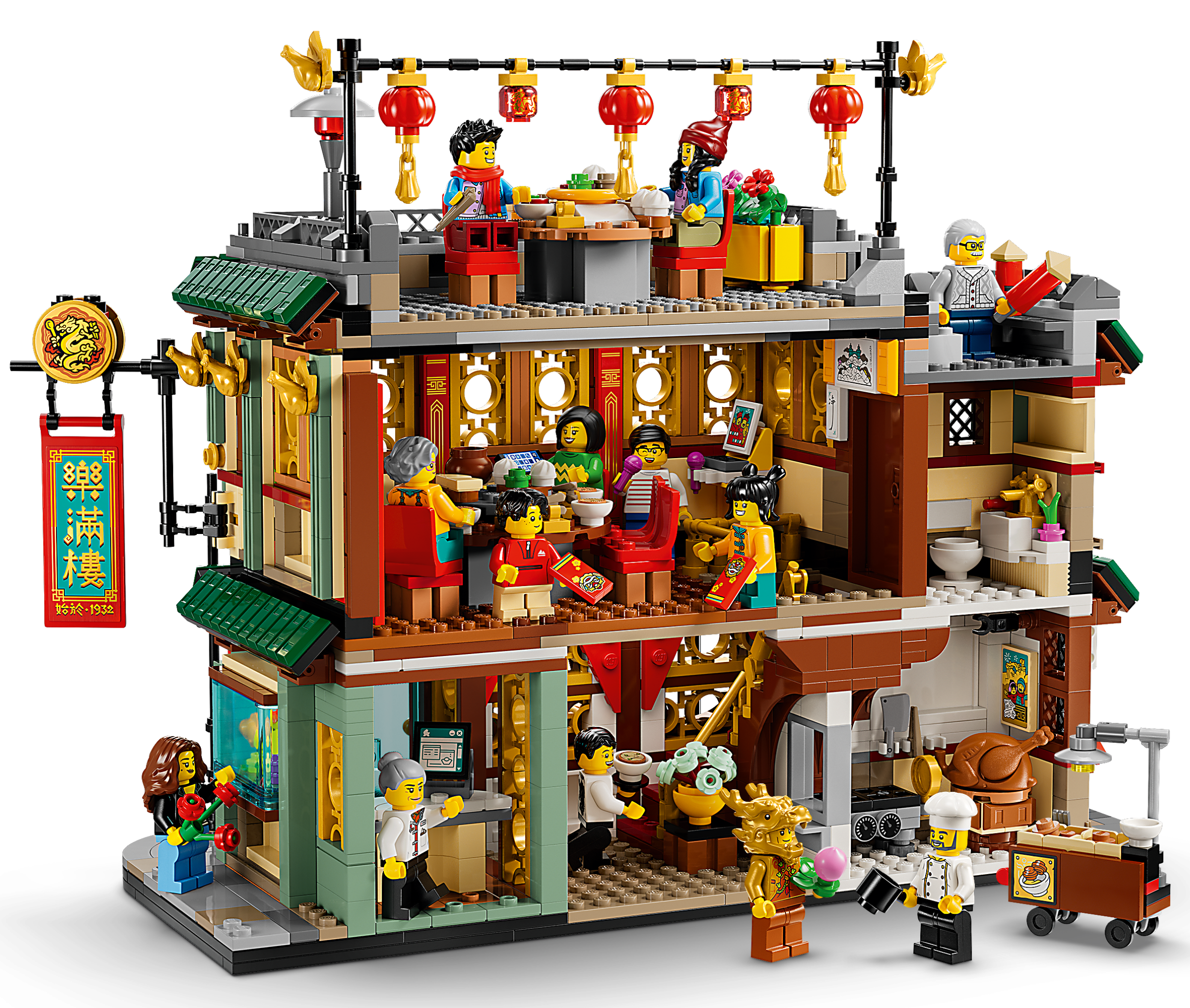 • 13 LEGO® Minifiguren erwecken das Mondneujahrsfest zum Leben: 2 Eltern, 2 Kinder, 2 Großeltern, ein Tourist, ein Pärchen, ein Koch, 2 Kellner sowie eine Figur in einem Jahr-des-Drachen-Kostüm