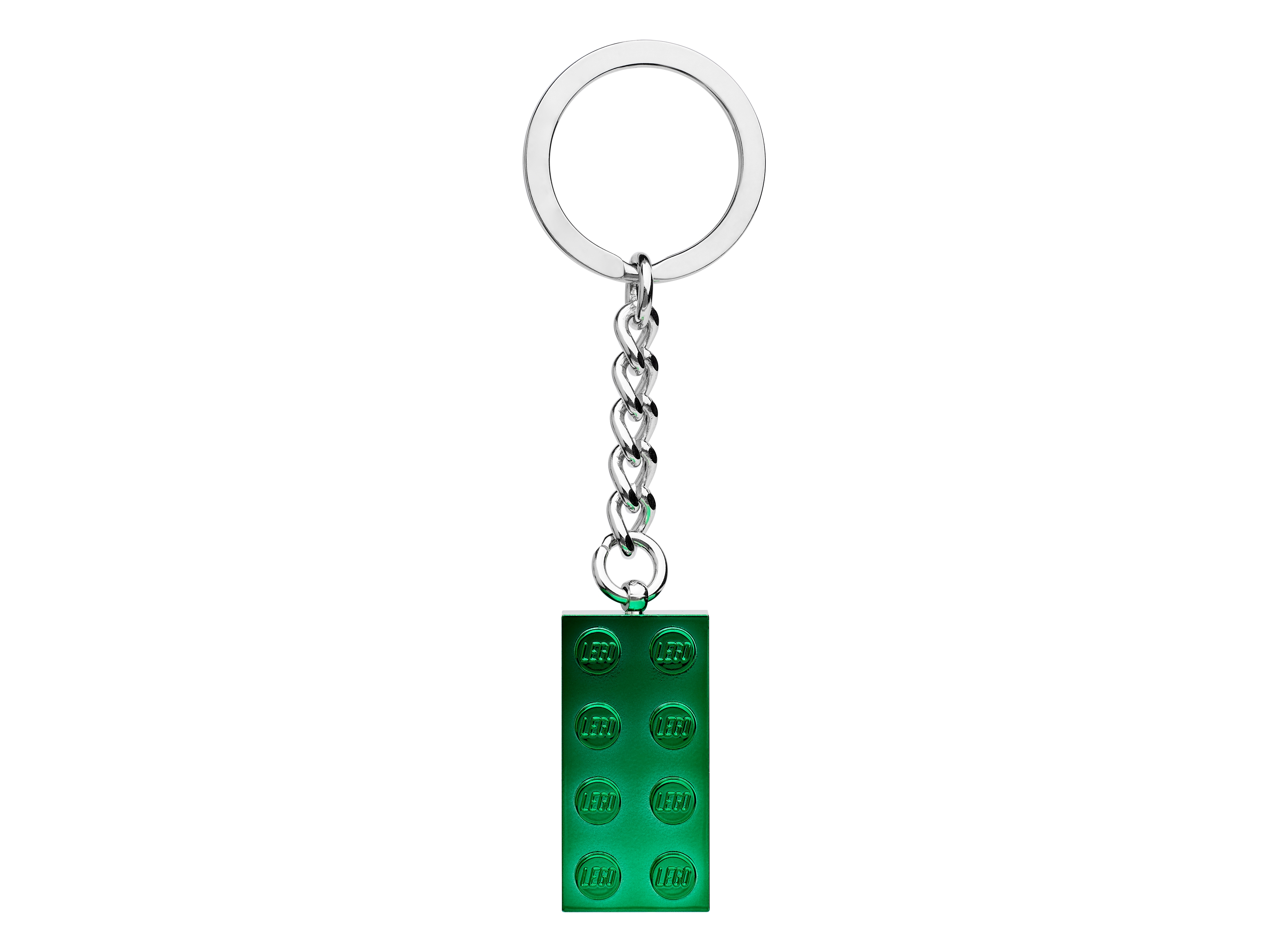 Der Schlüsselanhänger besteht aus einem 2x4 Stein in Grünmetallic, der mit einer robusten Kette an einem Ring befestigt ist.