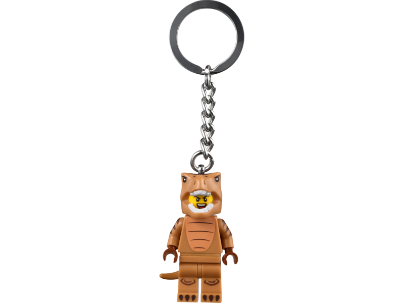 Mann im T.Rex-Kostüm Schlüsselanhänger: Die LEGO® Minifigur trägt ein tolles T.Rex-Kostüm und hängt an einer robusten Metallkette mit Schlüsselring